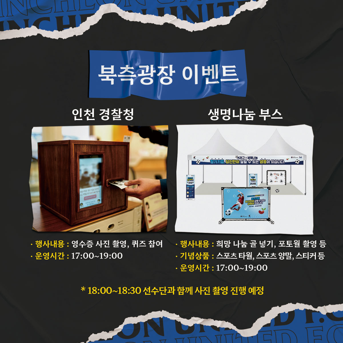 북측광장에서 인천경찰청과 함께 하는 7대 악성사기 예방 캠페인, 장기조직기증 캠페인 부스 등 다양한 이벤트존을 운영합니다. 인천 팬 여러분의 많은 관심과 참여를 부탁드립니다!