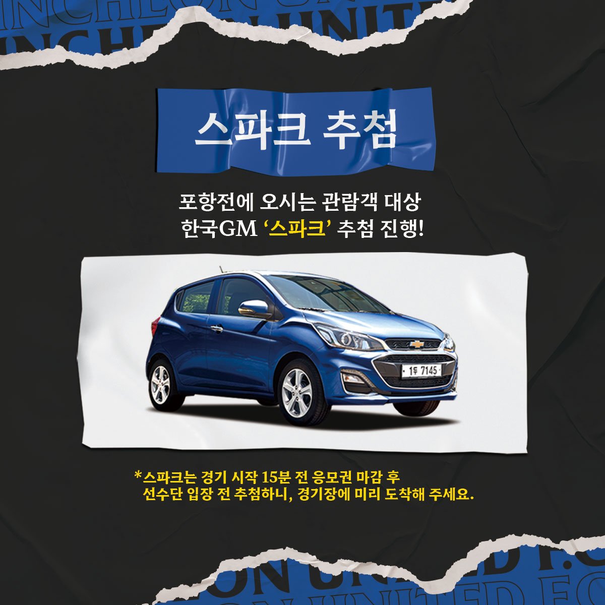 포항전에 오시는 관람객분을 대상으로 한국GM 스파크 승용차 경품 추첨이 있습니다.