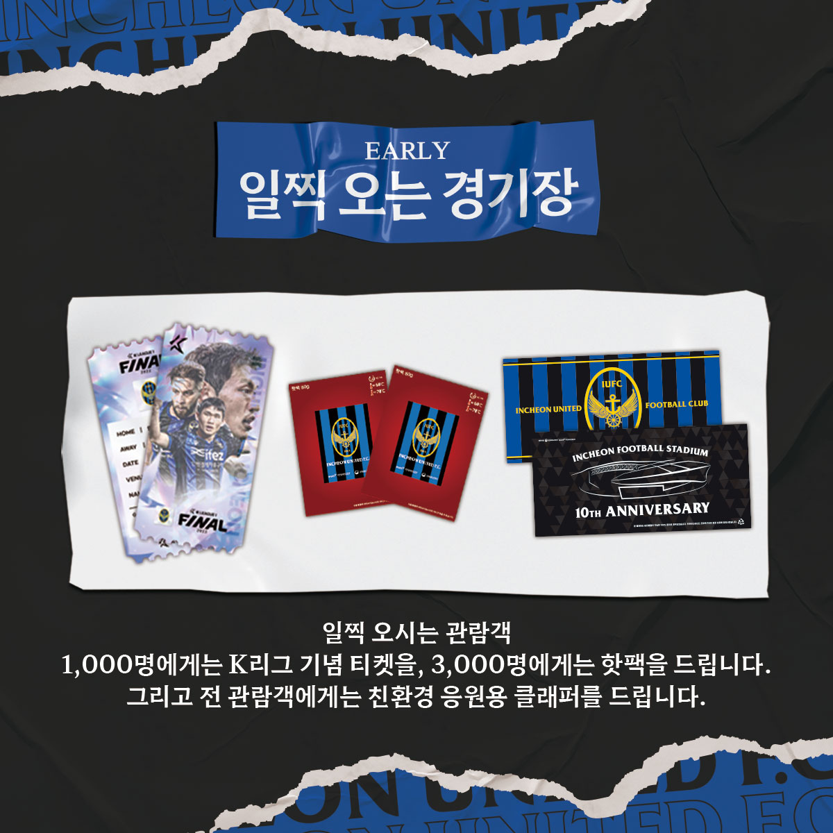 이번 포항전 홈경기 경기장에 일찍 찾는 '얼리버드 관람객' 선착순 1,000명에게는 연맹 기념 티켓을, 3,000명에게는 핫팩을, 그리고 입장객 전원에게는 응원용 친환경 클래퍼를 드립니다!