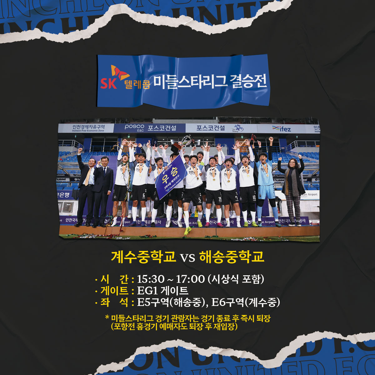 경기 전 열리는 인천계수중학교와 해송중학교의 결승전에 인천 팬 여러분의 많은 관심과 응원을 부탁드립니다!