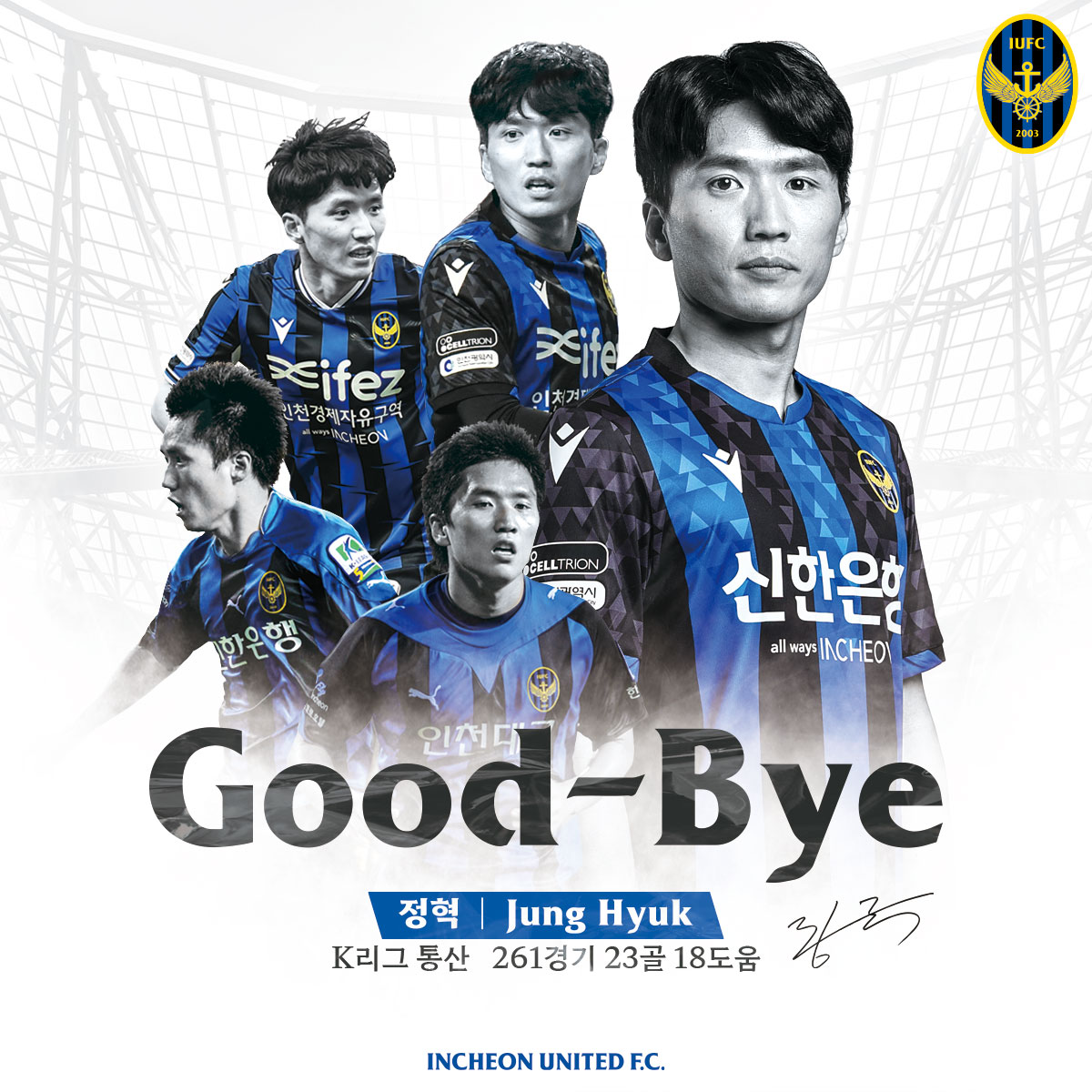 2009년 인천에 데뷔해 2022년 친정 팀 인천에서 은퇴하는 정혁 선수가 그간 보준 헌신과 최고의 퍼포먼스에 깊은 감사를 드리며, 제2의 축구인생도 변함없이 응원하겠습니다.