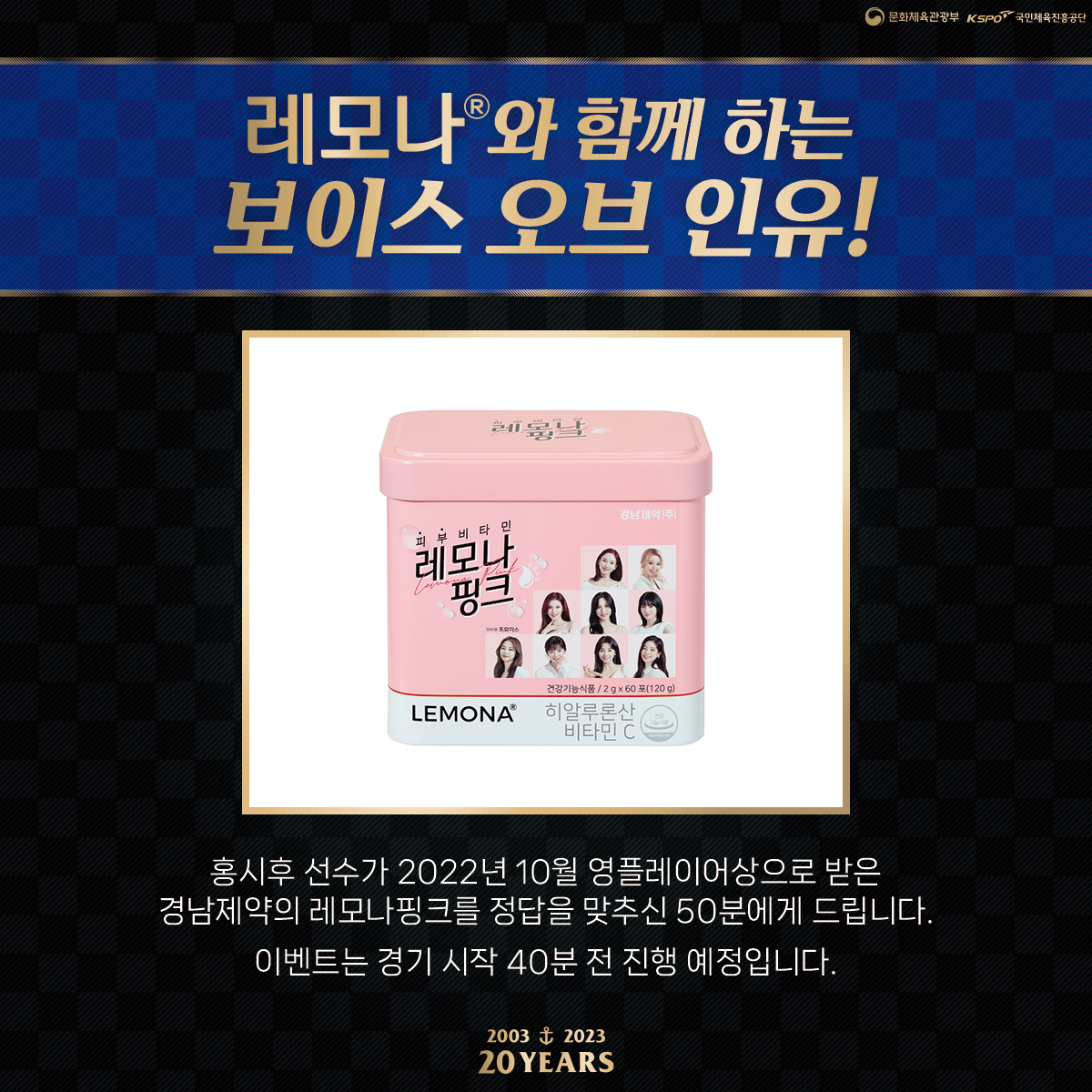 이번 보이스 오브 인유 정답자에게는 2022년 10월 영플레이어상을 수상한 홍시후 선수가 받은 경남제약의 레모나 핑크를 드립니다!