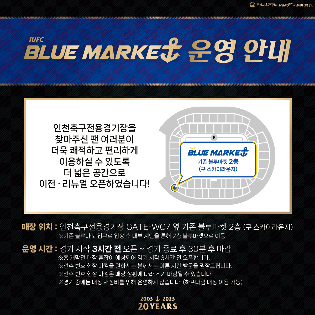 ※ 경기 시간(19:00~20:30)에는 매장 재정비를 위해 운영되지 않습니다. 단, 하프타임 시간에는 운영됩니다.▶ 티켓구매 : https://iufc.kr/ti▶ 고객센터 : 032-880-5500