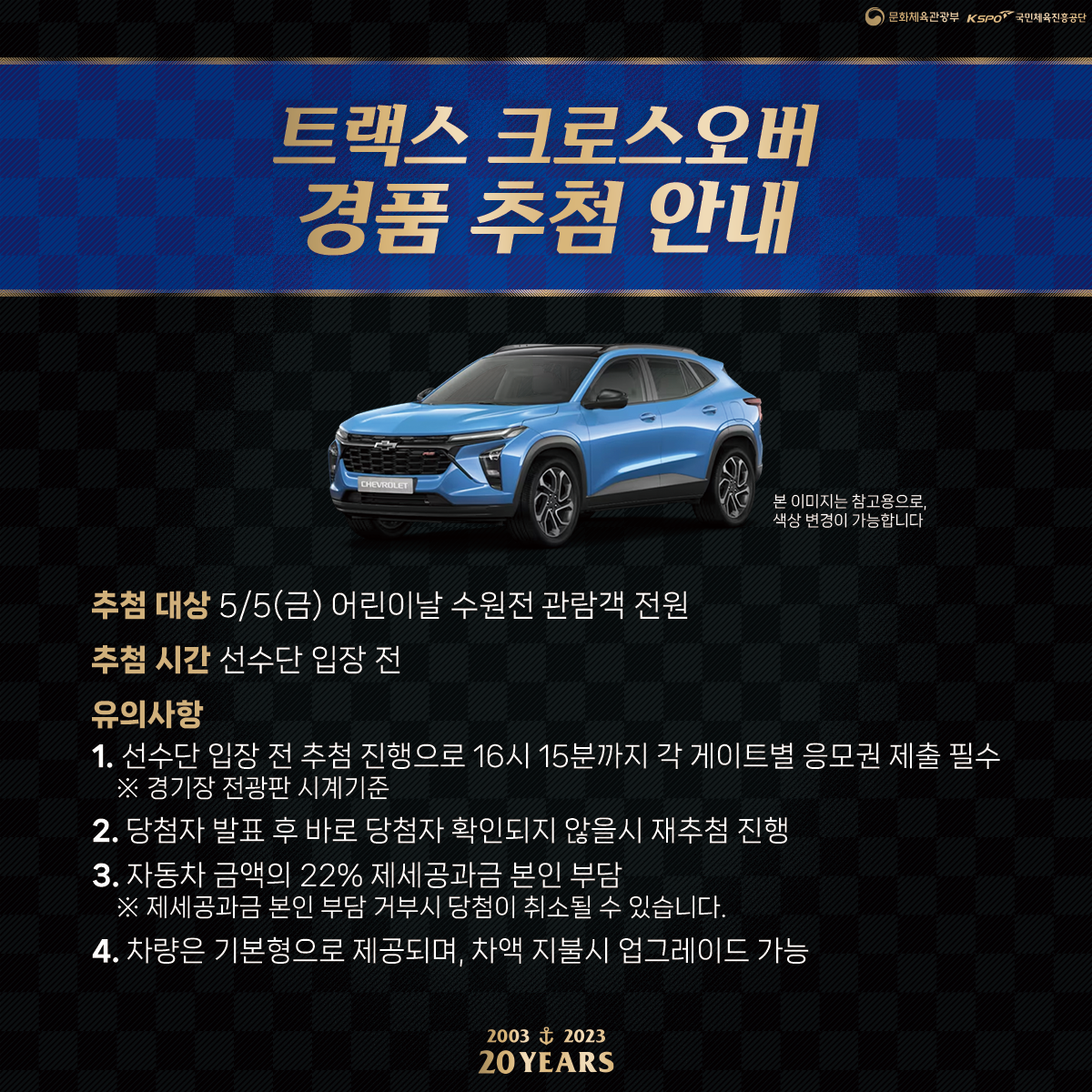 당일 홈경기에 찾아주신 팬 여러분 대상 트랙스 크로스오버 승용차 경품 추첨이 선수단 입장 전 진행될 예정입니다. 자세한 내용은 이미지를 참고해주세요!