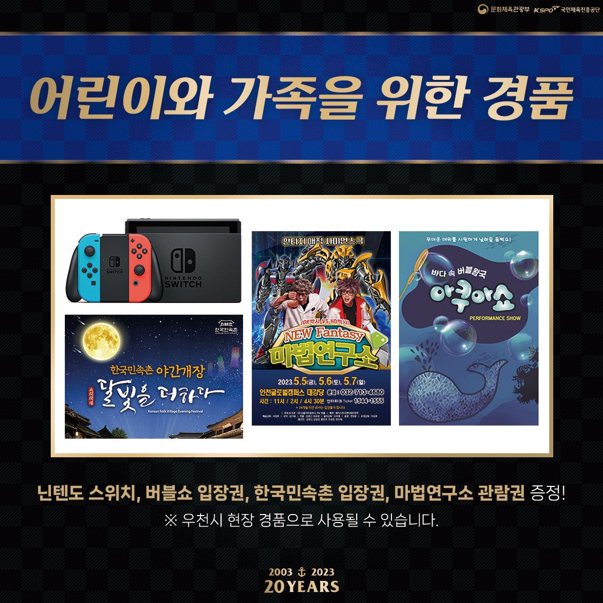 (*닌텐도 스위치, 버블쇼 입장권, 한국민속촌 입장권, 마법연구소 관람권, 송도외과 검진권, 컬러런 입장권 등)