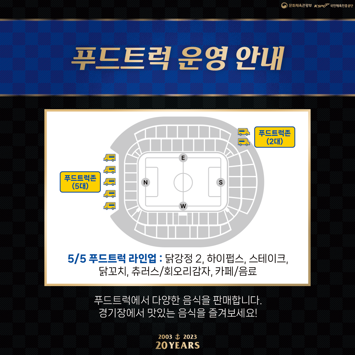 북측광장과 S석 게이트 옆 푸드트럭에서 다양한 음식을 판매합니다. 경기장에서도 맛있는 음식을 즐겨보세요!