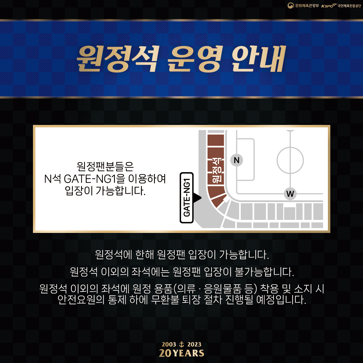 원정석 이외의 좌석에는 원정팬 입장이 불가능합니다. 원정석 이외의 좌석에서 원정 용품(의류, 응원 물품 등) 착용 및 소지 시에는 안전요원의 통제하에 경고 없이 무환불 퇴장 절차가 진행될 예정이오니 참고 바랍니다.