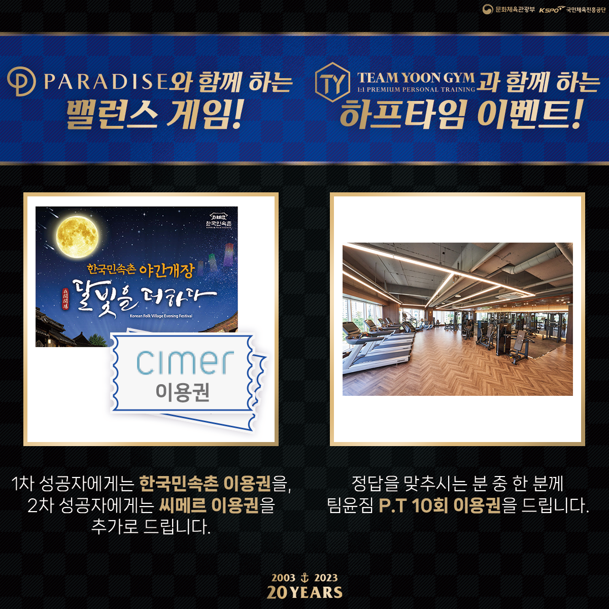 경기 전 밸런스 게임 정답을 맞추시는 분들께는 한국민속촌 이용권과 씨메르or원더박스 이용권을 드립니다!