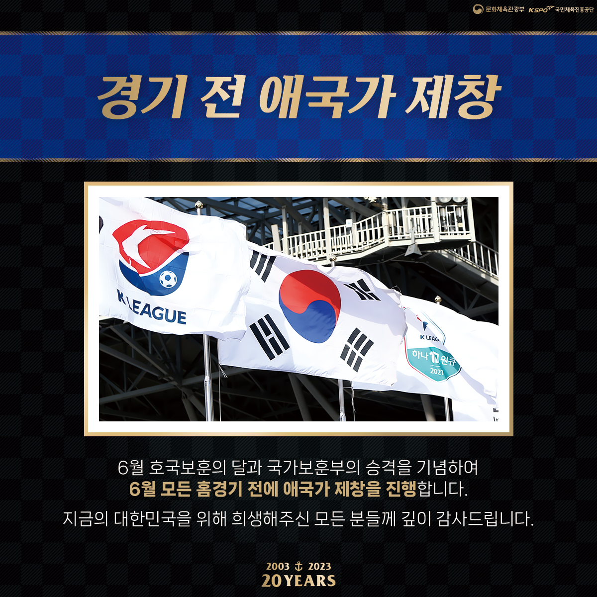 6월 호국보훈의 달과 국가보훈부의 승격을 기념하여 6월 모든 홈경기 전에 애국가 제창을 진행합니다.