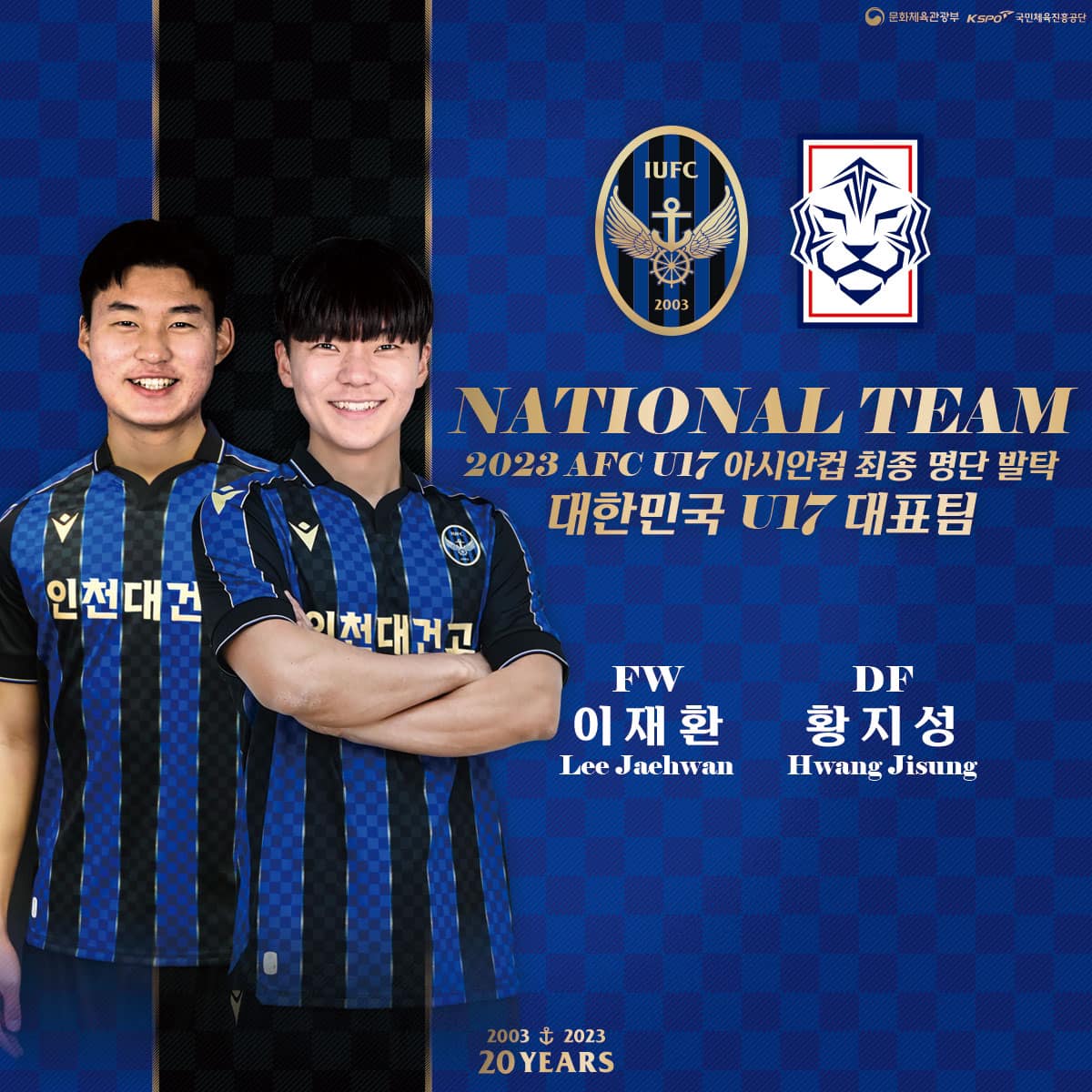 인천유나이티드 산하 U18 대건고 소속 이재환, 황지성 선수가 2023 AFC U17 아시안컵 본선에 참가하는 대한민국 U17 국가대표팀 최종 명단에 당당히 이름을 올렸습니다!