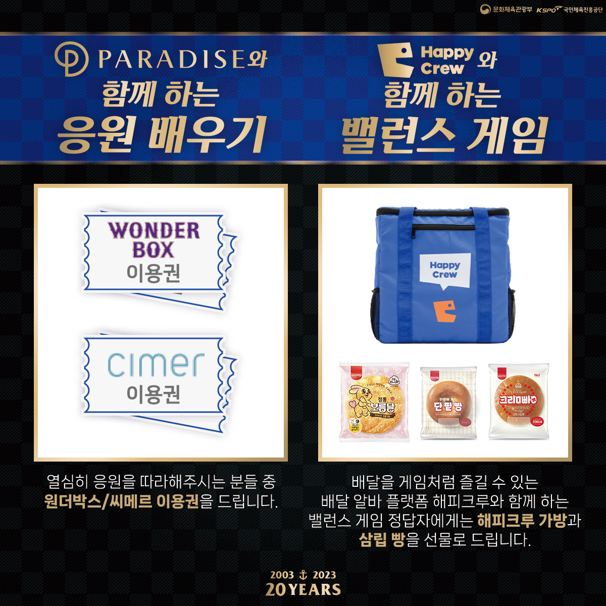 경기 전 응원배우기 이벤트에 적극적으로 참여해주시는 팬 여러분을 대상으로 파라다이스시티 씨메르 or 원더박스 이용권을, 밸런스 게임의 정답을 맞추시는 분들께는 해피크루 가방과 삼립빵을 선물로 드립니다!