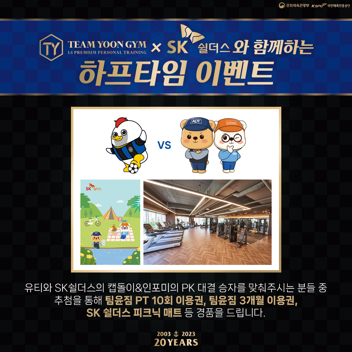 유티와 SK쉴더스의 캡돌이&인포미의 하프타임 PK 대결! 정답을 맞춰주시는 분들 중 추첨을 통해 팀윤짐의 PT 10회 이용권과 3개월 이용권, SK쉴더스의 피크닉 매트를 선물로 드립니다!