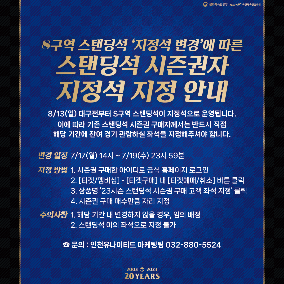 이에 따라 2023시즌 스탠딩석 시즌권 구매자께서는 해당 기간에 잔여 경기 관람하실 좌석을 지정해주셔야 합니다.