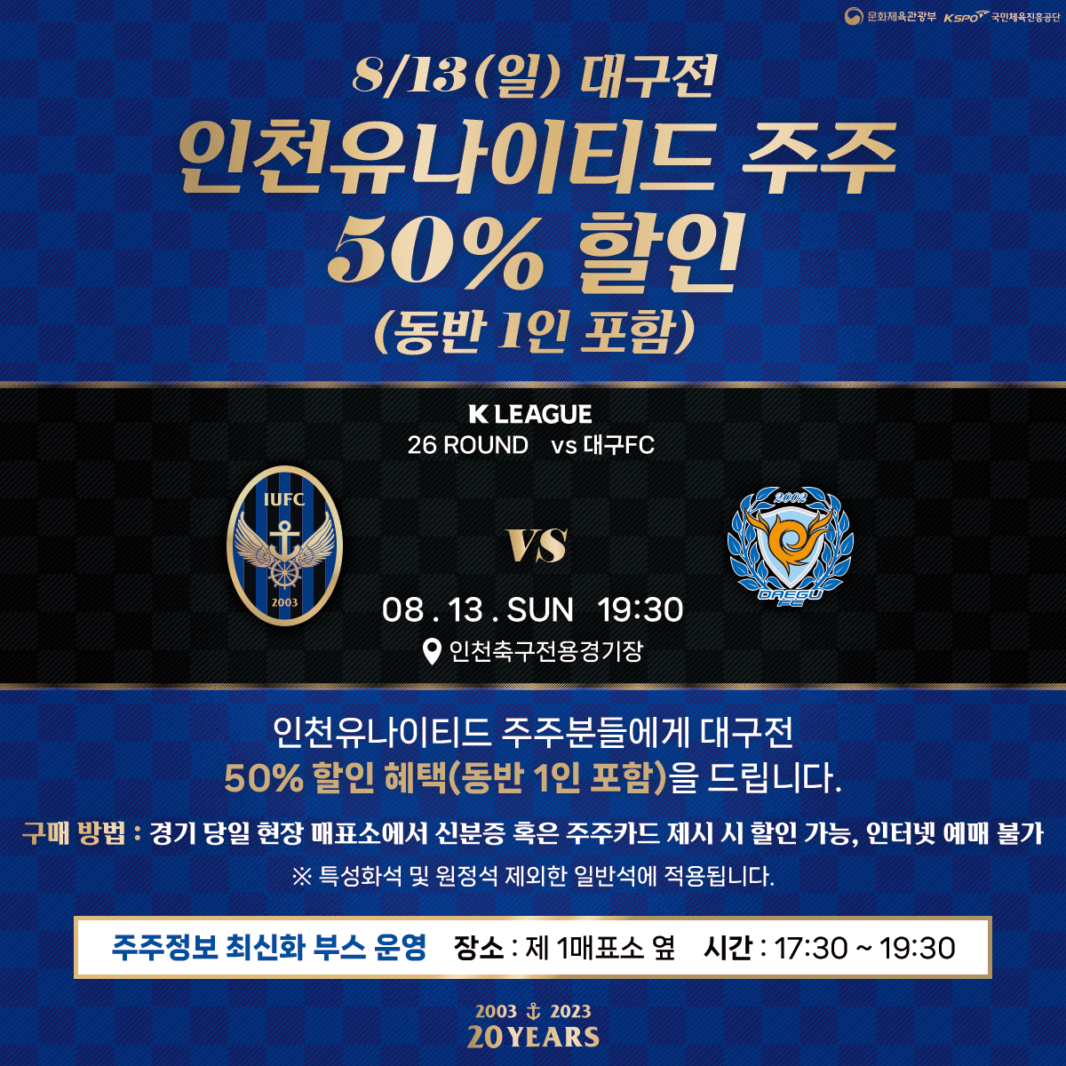 지난 7/16 대전전 이후 약 한 달만에 개최되는 K리그1 홈경기를 맞이하여 인천유나이티드 주주분들에게 50% 할인 혜택을 드립니다.