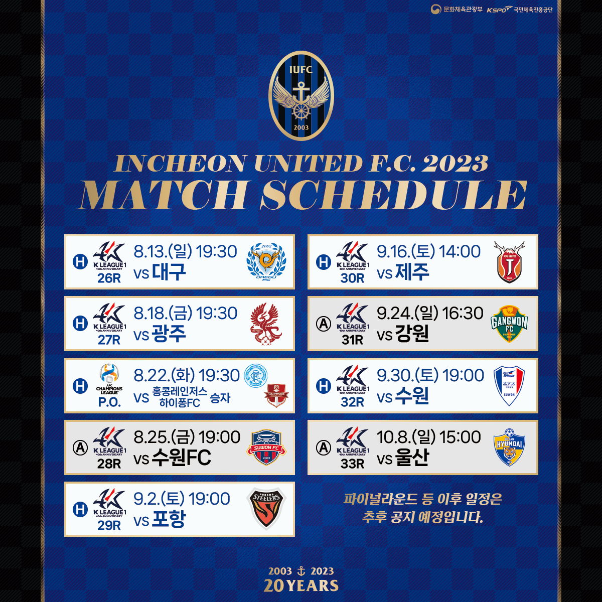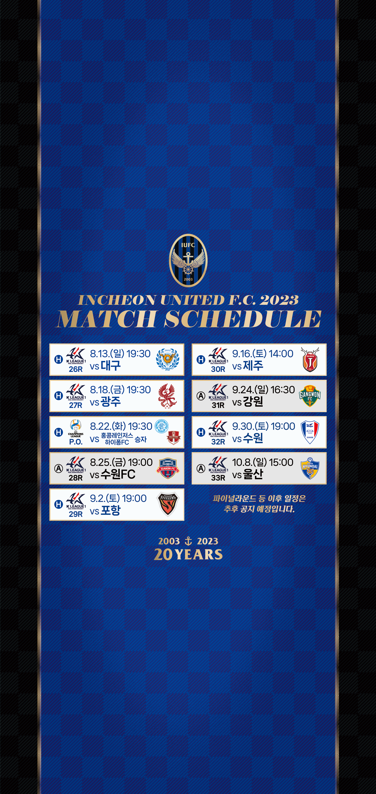 안녕하세요, 인천유나이티드입니다. 8월 기준 2023 하나원큐 K리그 1과 AFC 챔피언스리그 플레이오프 일정 안내해드립니다.