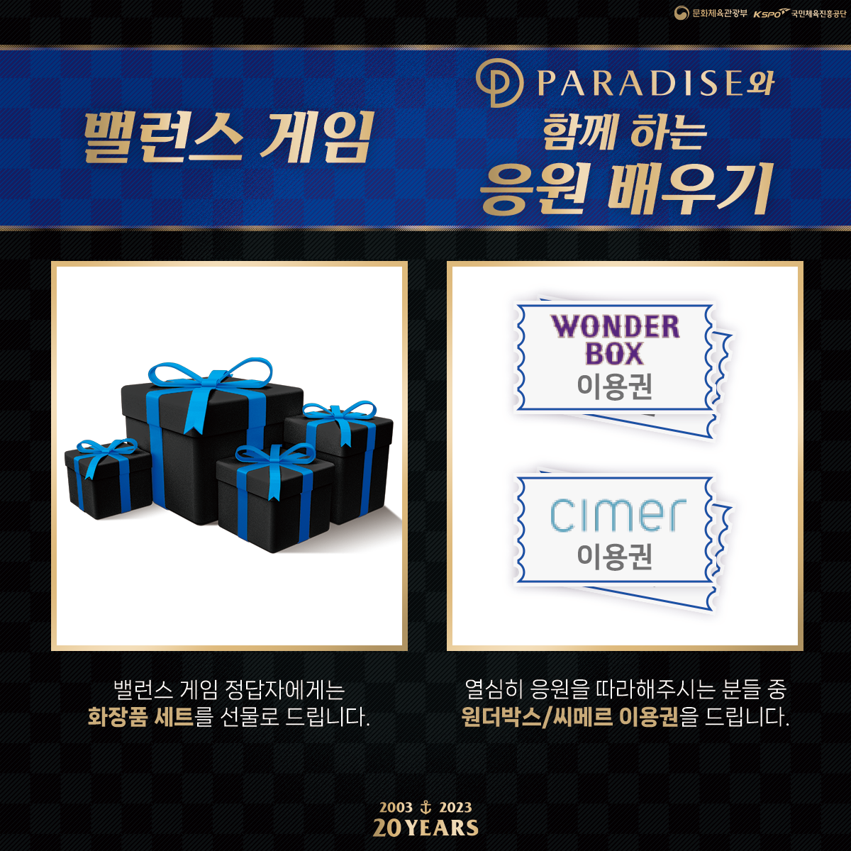 밸런스게임 정답자에게는 화장품 세트를, 파라다이스시티와 함께 하는 응원배우기에서 열심히 응원을 따라해주시는 분들께는 파라다이스시티 원더박스 or 씨메르 이용권을 드립니다.