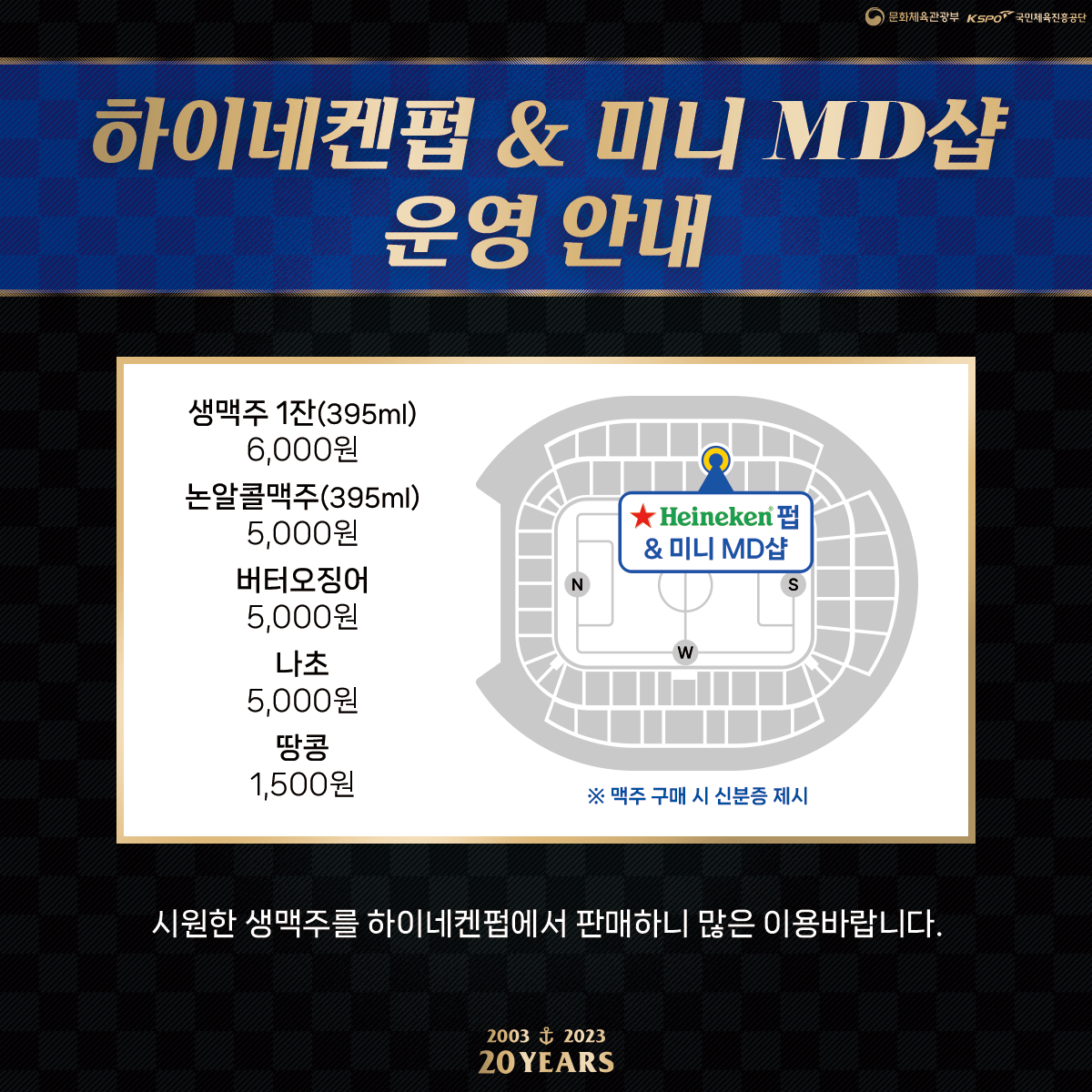 경기장 내 시원한 생맥주를 하이네켄펍에서 판매합니다. 또한 하이네켄펍 내 미니 MD샵도 운영중이니 많은 이용바랍니다.