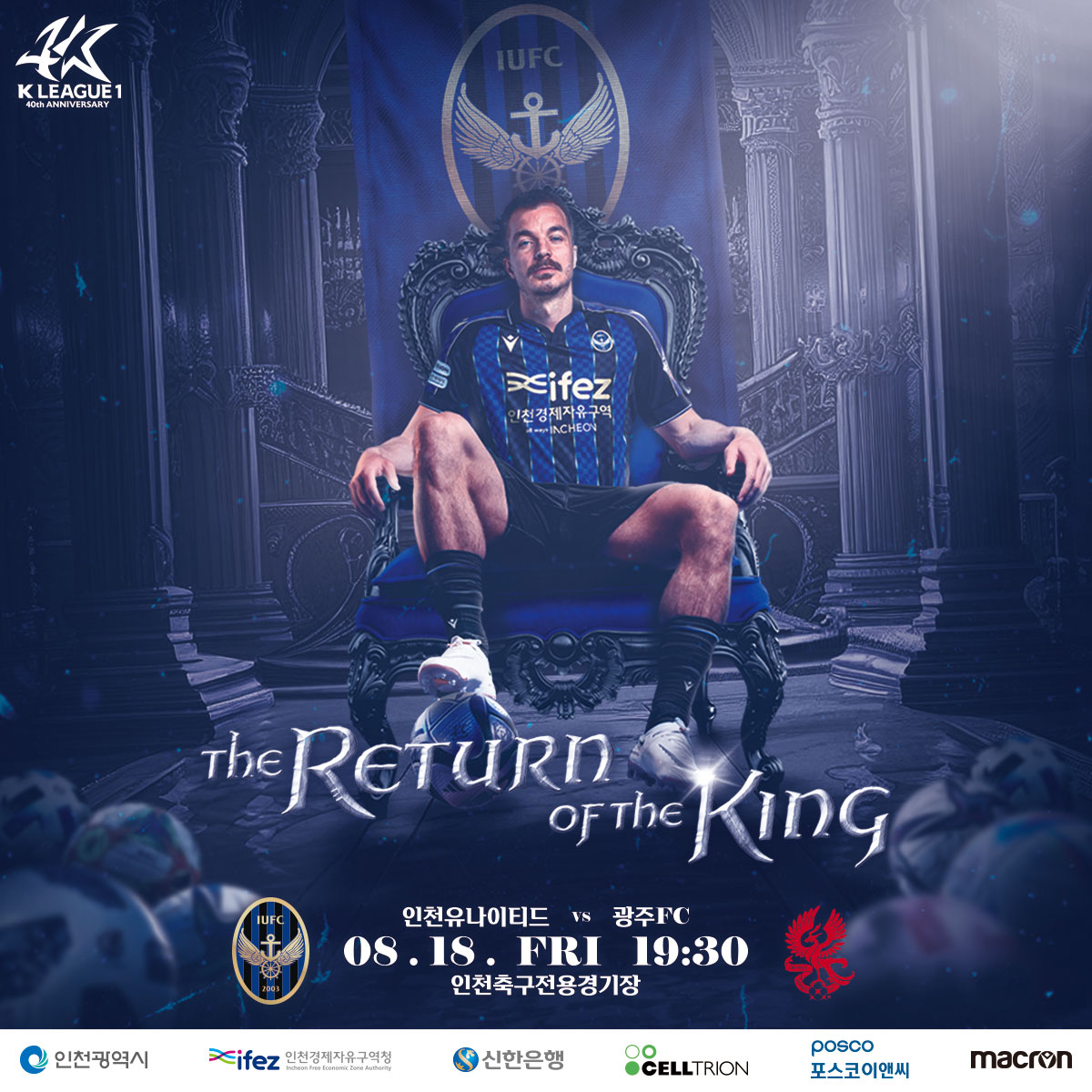"안방에서, 왕의 귀환을 목격하라"8/18(금) 오후 7시 30분. 인천유나이티드가 광주FC를 상대로 승리를 노립니다.