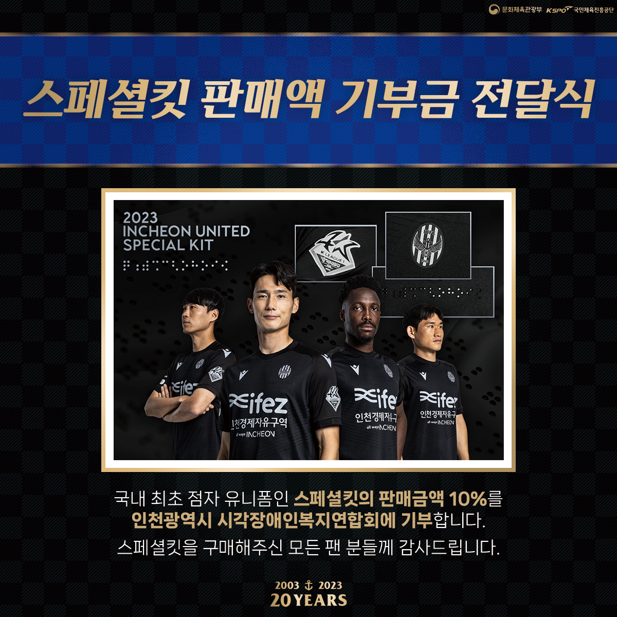 스페셜 유니폼 판매액 기부금 전달식시각장애인을 위해 국내 최초 점자 유니폼으로 출시된 2023 인천유나이티드 스페셜 킷의 상반기 판매금액 10%를 ‘인천광역시 시각장애인복지연합회‘에 기부합니다.