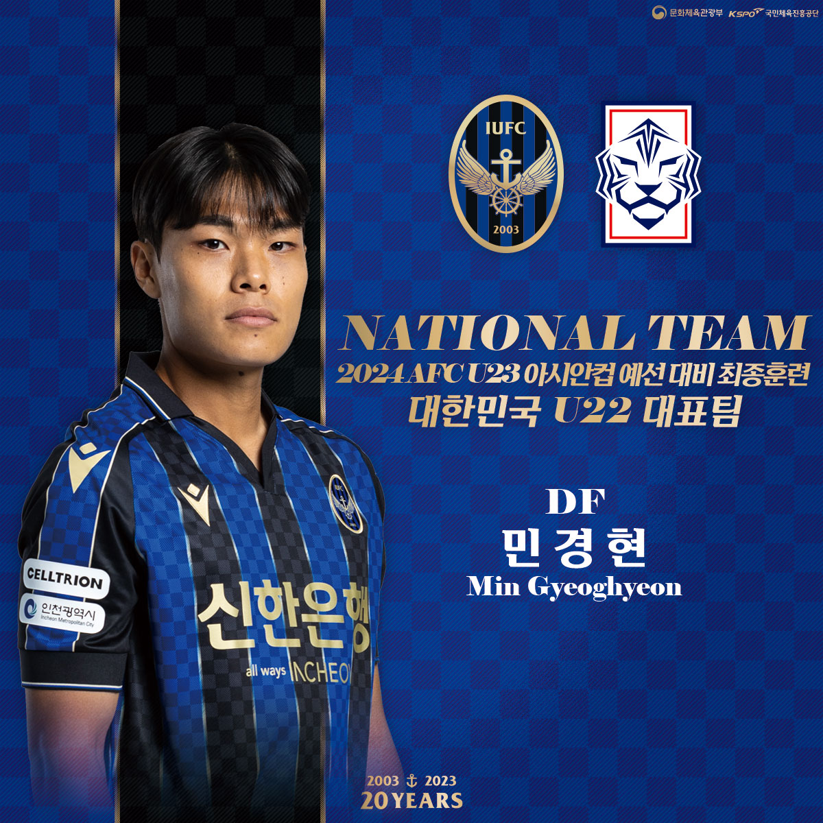 인천유나이티드 민경현 선수가 2024 AFC U23 아시안컵 예선 대비 최종훈련 대한민국 U22 대표팀 소집 명단에 이름을 올렸습니다