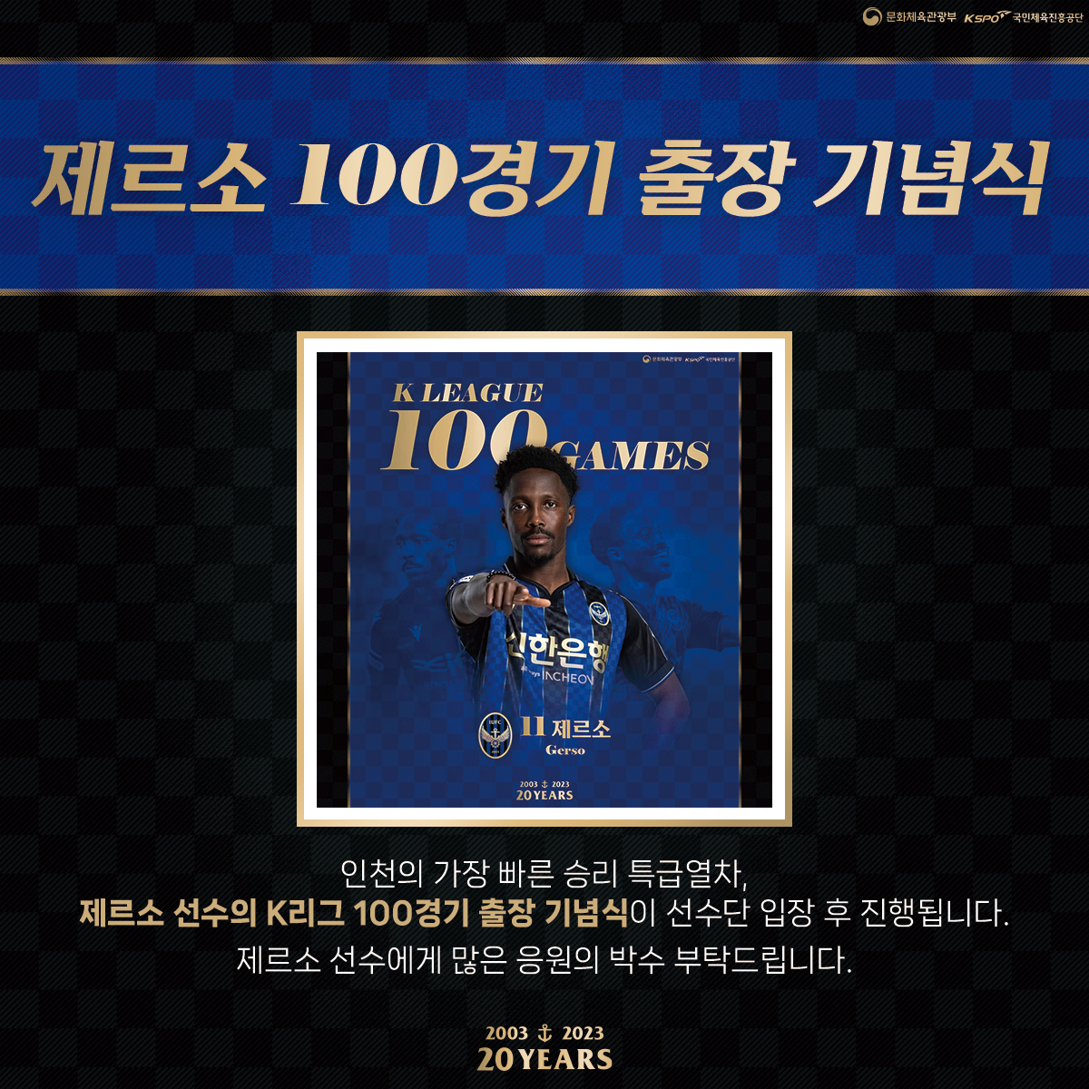 인천의 승리로 가는 가장 빠른 특급열차! 제르소 선수의 K리그 통산 100경기 출장 기념식이 선수단 입장 후 진행됩니다.