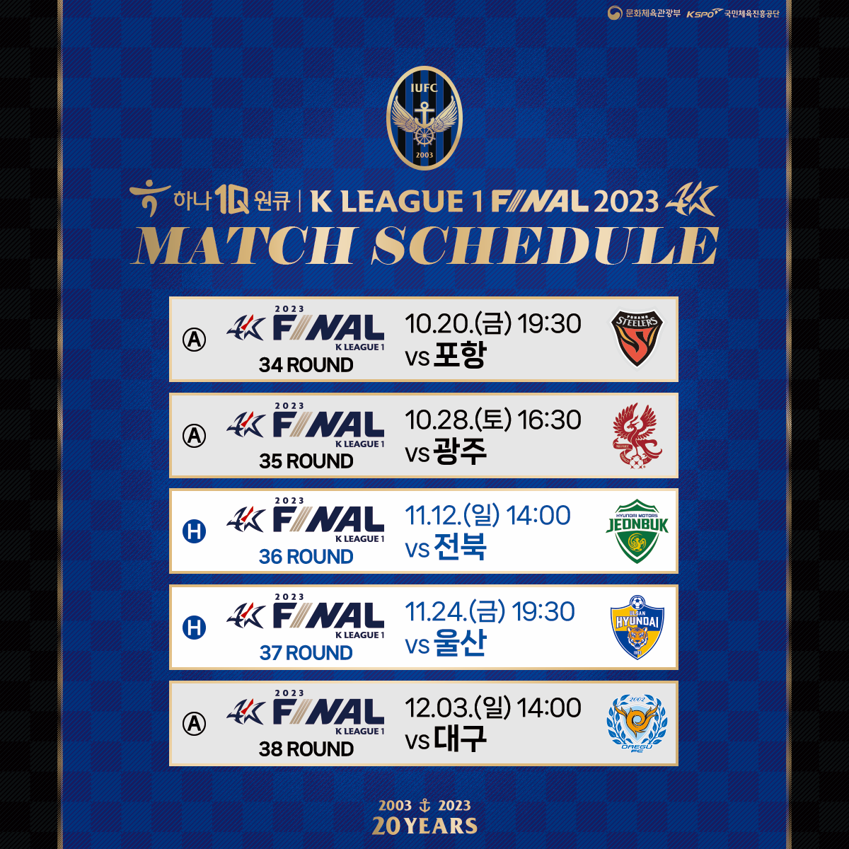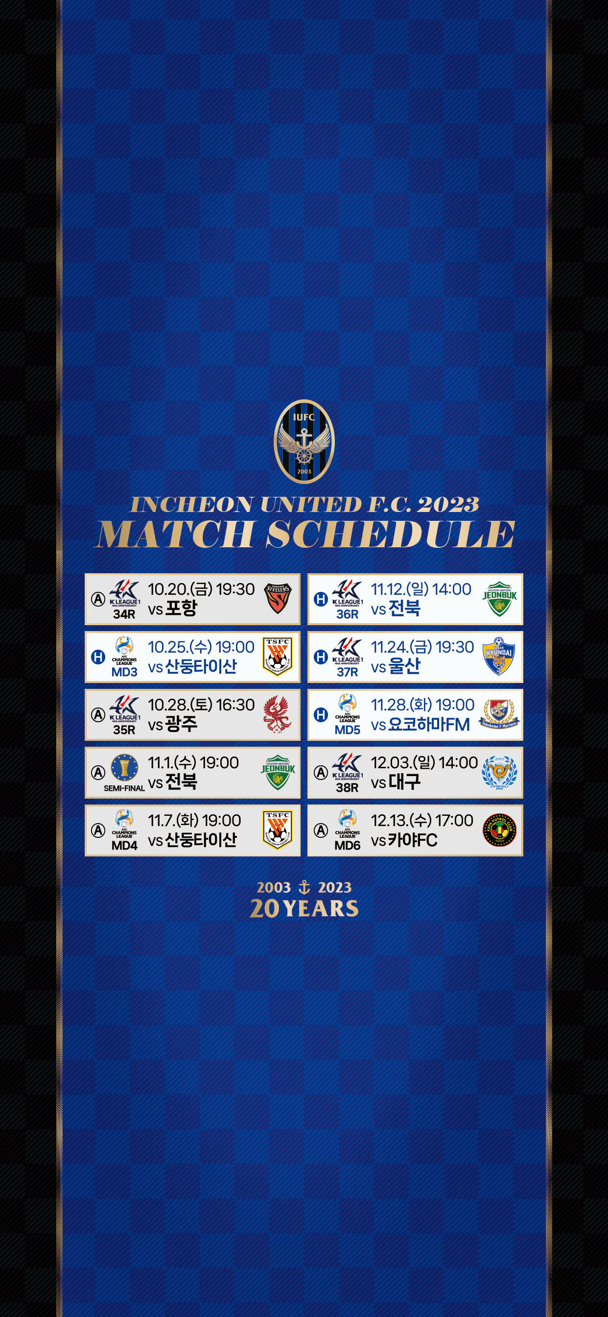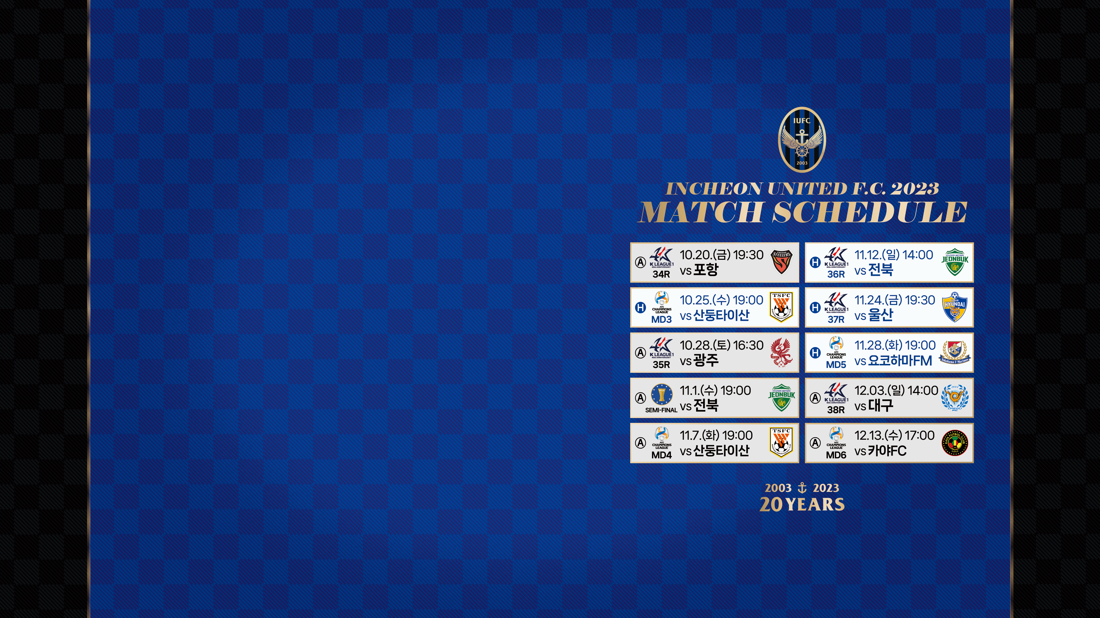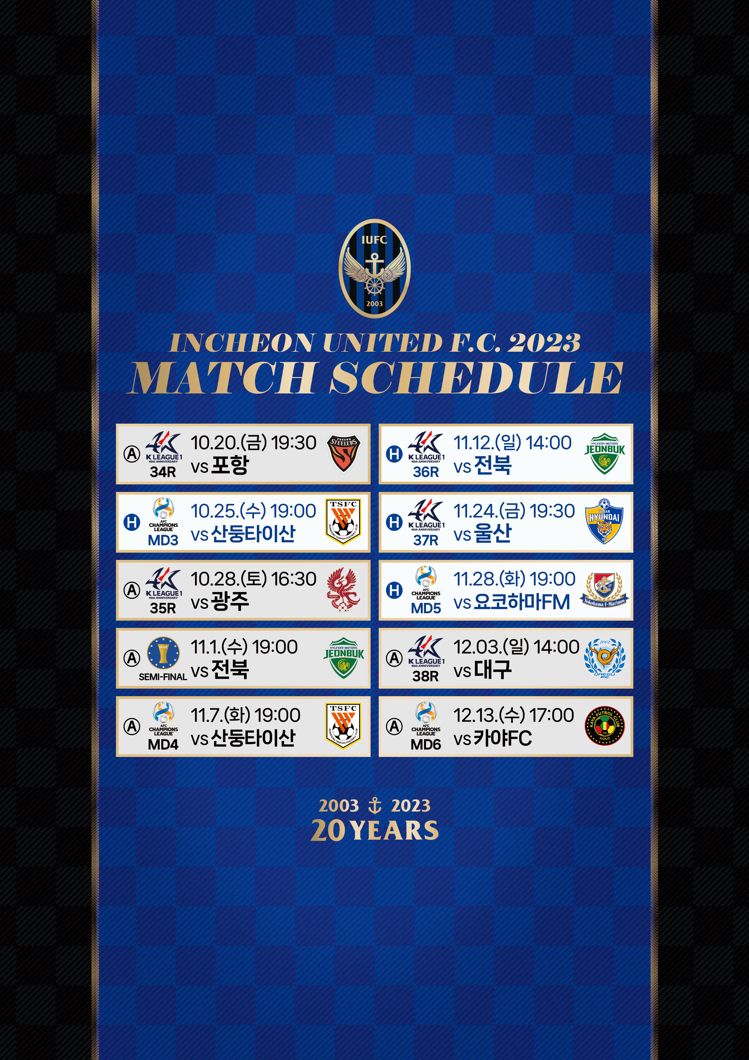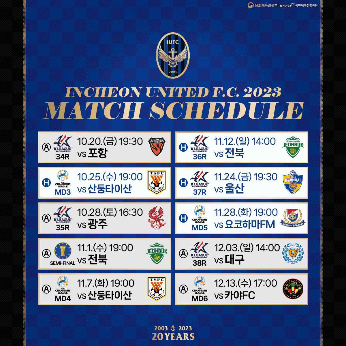 안녕하세요, 인천유나이티드입니다. 하나원큐 K리그 1 2023 파이널라운드 일정이 포함된 2023년 10월 기준 경기 일정을 안내해드립니다.