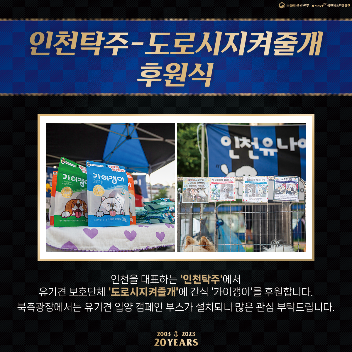 경기 전 인천탁주와 도로시지켜줄개의 후원식이 있습니다. 또한 북측광장에서 유기견 입양 캠페인 부스를 운영합니다. 유기견들이 좋은 주인을 만날 수 있도록 인천유나이티드가 응원합니다.