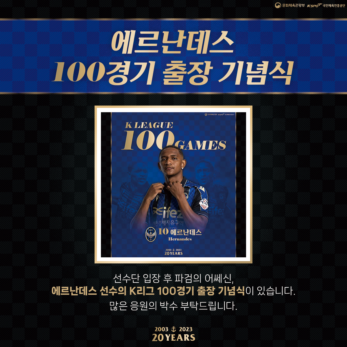 파검의 어쎄신 에르난데스 선수의 K리그 100경기 출장 기념식이 선수단 입장 후 진행됩니다. 에르난데스 선수가 전북전 승리를 이끌 수 있도록 많은 응원 부탁드립니다.