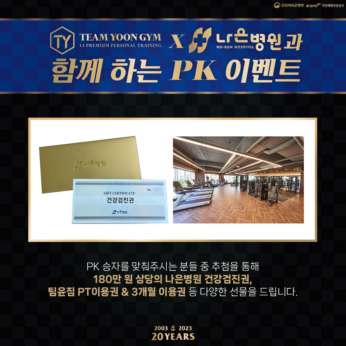하프타임 이벤트의 승자를 맞춰주시는 분들 중 추첨을 통해 나은병원 건강검진권과 팀윤짐 PT이용권과 3개월 이용권을 드립니다.