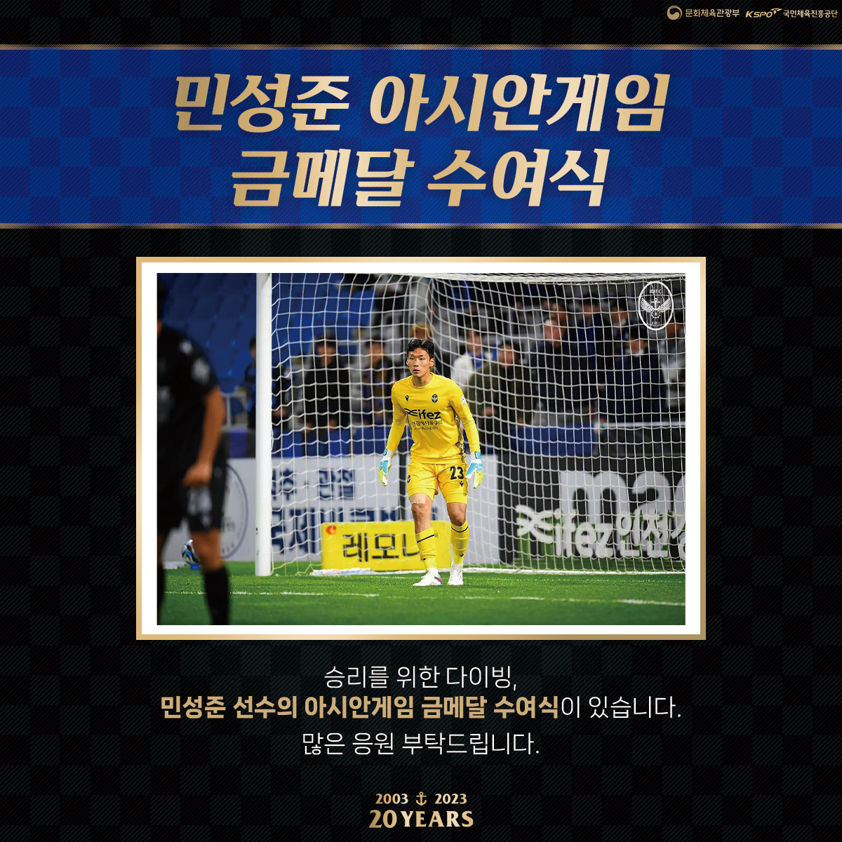 승리를위한 다이빙 GK 민성준 선수의 아시안게임 금메달 수여식이 선수단 입장 후 진행됩니다. 인천 소속 3번째 아시안게임 금메달리스트 민성준 선수에게 많은 응원 부탁드립니다.