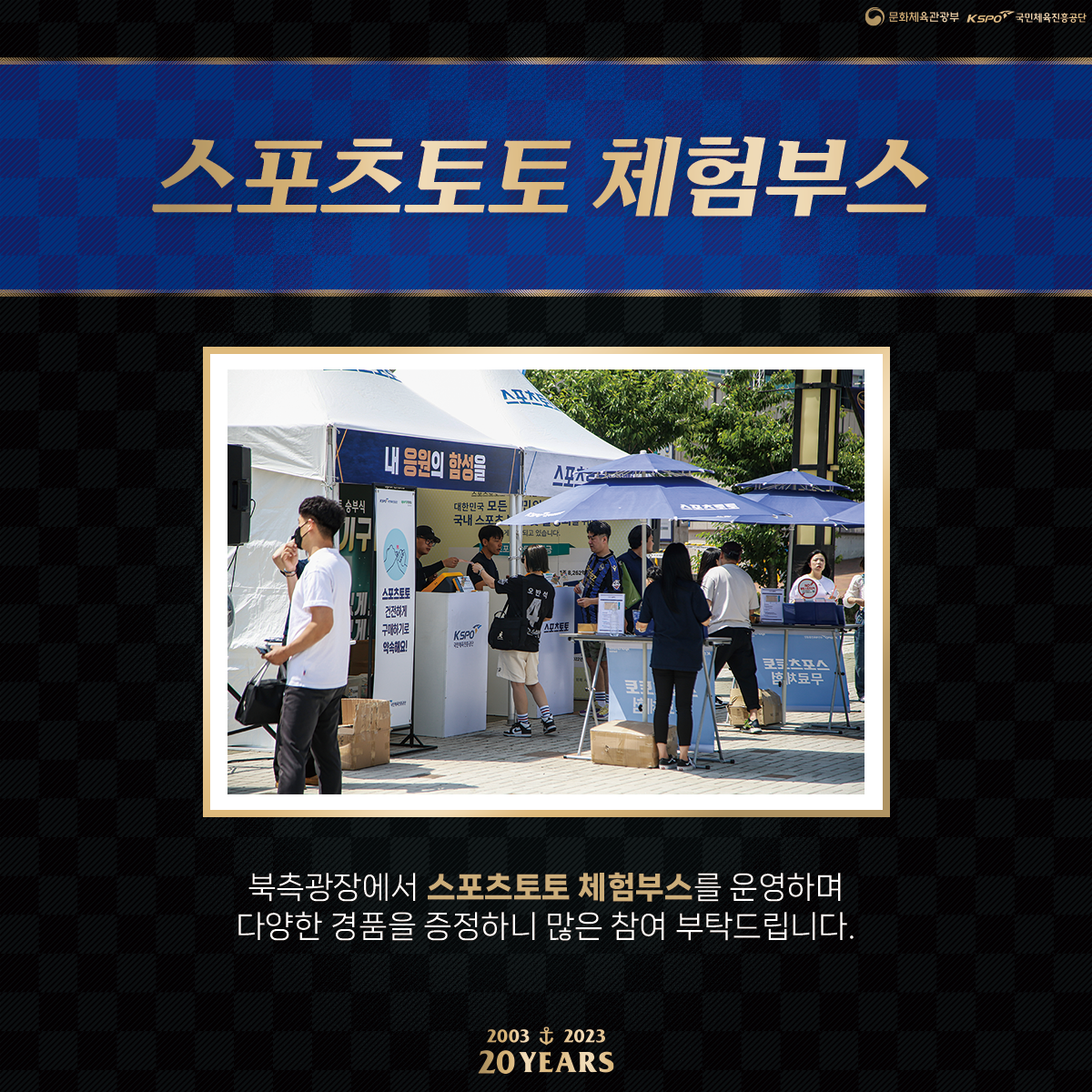 북측광장에서는 스포츠토토 체험 부스를 운영하며, 다양한 경품도 준비되어 있으니 많은 참여 부탁드립니다.
