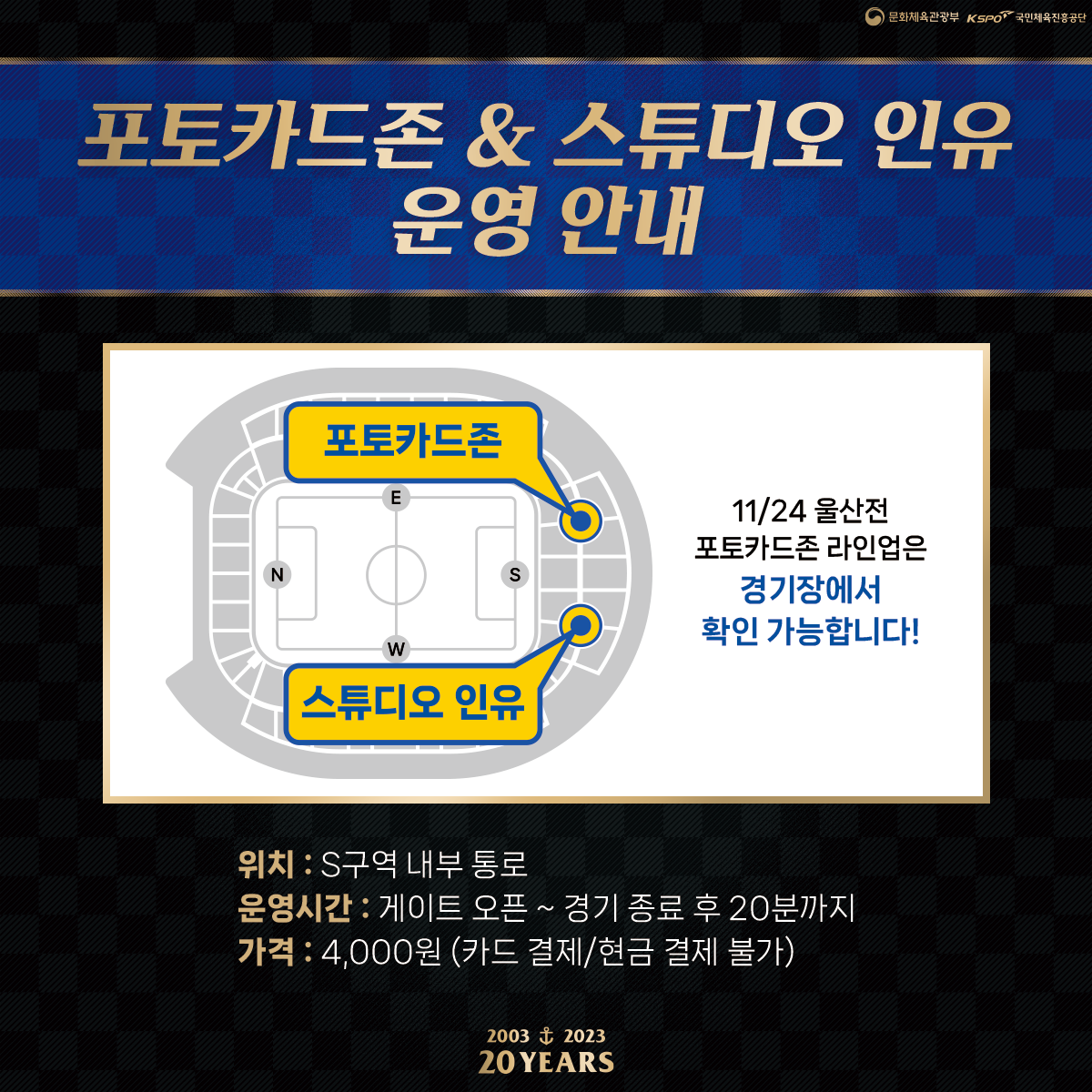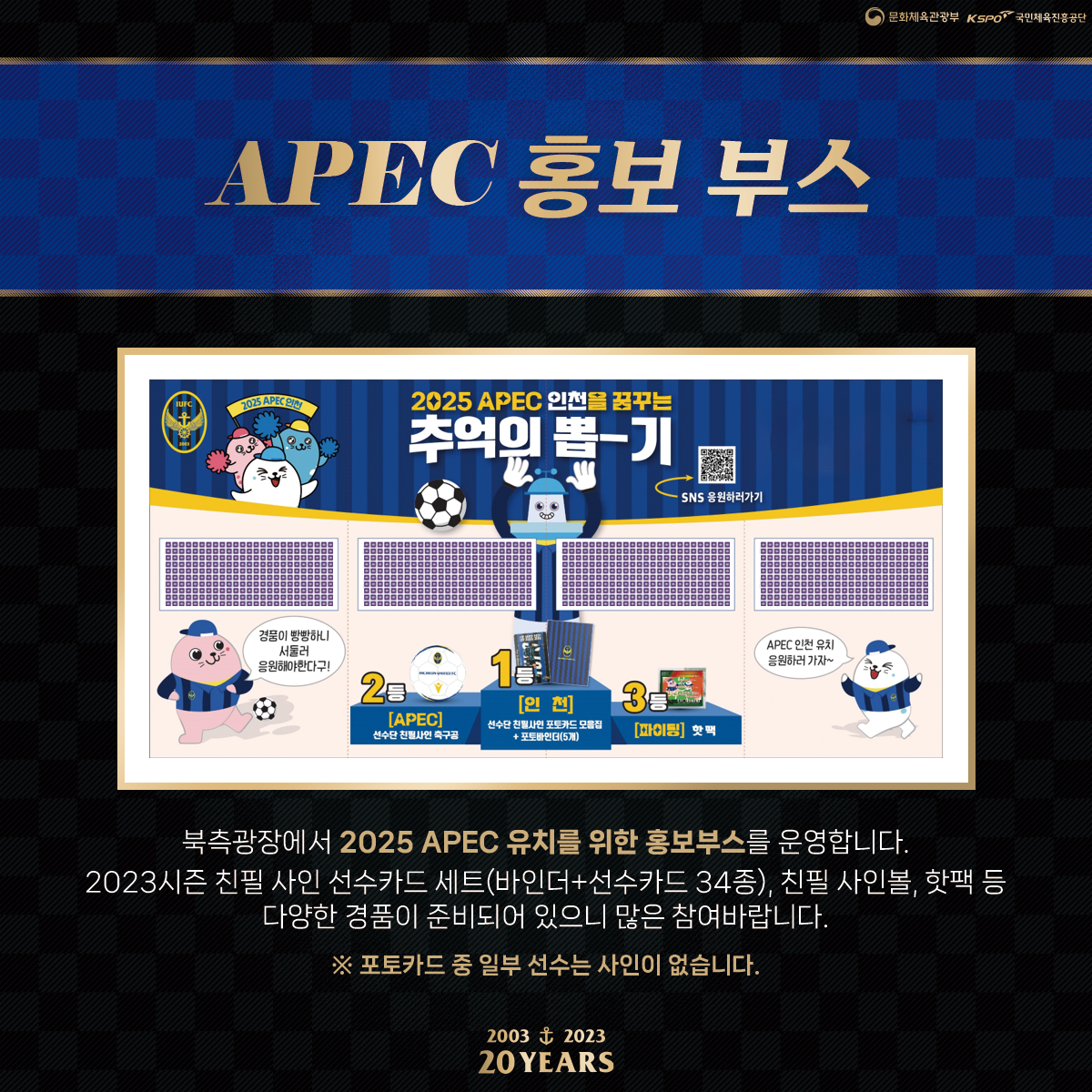 인천광역시의 2025 APEC 유치를 위한 홍보부스가 북측광장에서 운영됩니다. 2023시즌 선수단 친필 사인 포토카드 세트 와 친필 사인볼, 핫팩이 준비되어 있으니 많은 참여바랍니다.