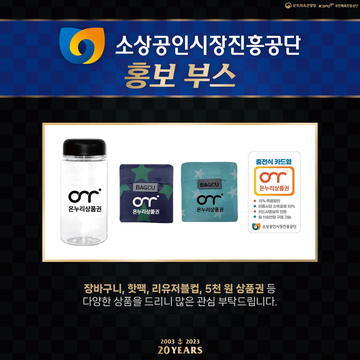 소상공 홍보 부스에 방문해주시는 팬 여러분을 대상으로 장바구니, 핫팩, 리유저블컵, 5천원 상품권 등 다양한 상품을 드리니 많은 관심 부탁드립니다.