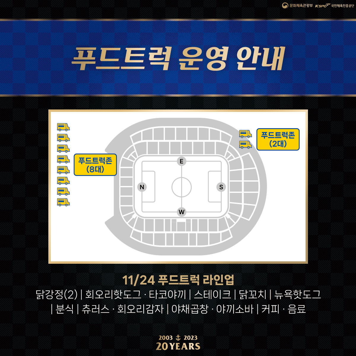 북측광장과 S석 게이트 옆 푸드트럭에서 다양한 음식을 판매합니다. 경기장에서도 맛있는 음식을 즐겨보세요!