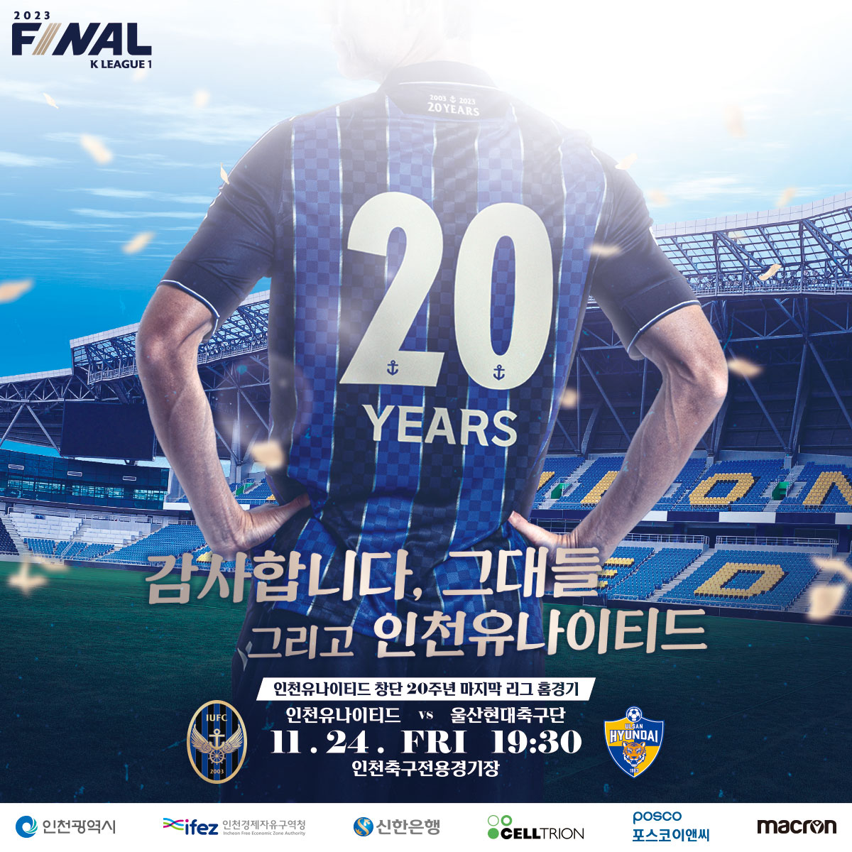 인천 시민, 그리고 팬 여러분! 금요일 저녁 인천축구전용경기장에 찾아오셔서 다함께 20년간 최선을 다해 팀을 응원한 서로를 격려해주시고, 인천의 승리를 응원해주세요!