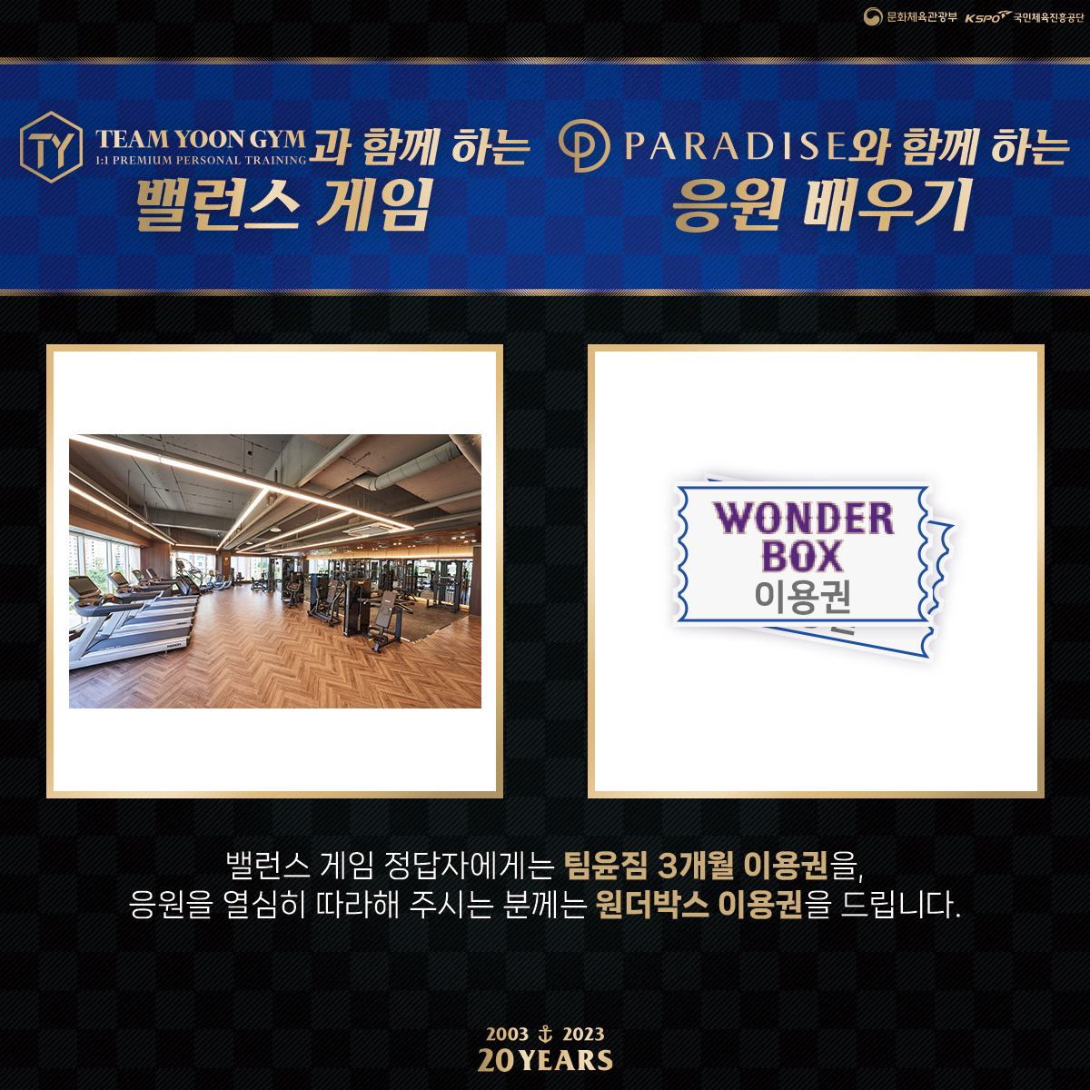 밸런스 게임 정답을 맞춰주시는 분들께는 팀윤짐 3개월 이용권을, 경기 전 응원배우기에서 열심히 응원을 따라해주시는 분들 중 원더박스 이용권을 드립니다.