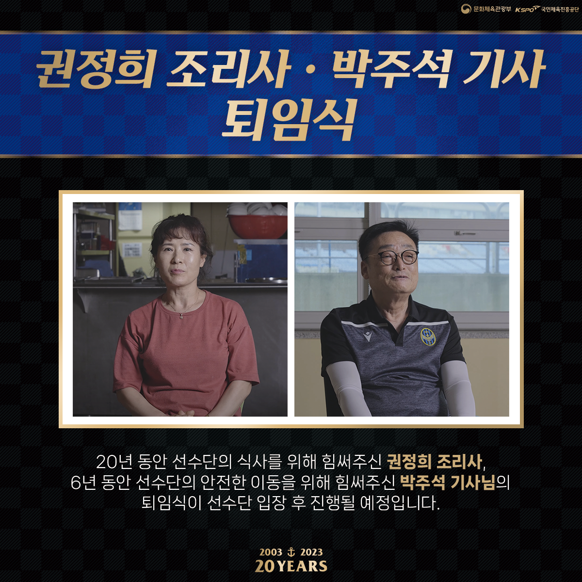 20년 동안 선수단의 식단을 위해 힘써주신 권정희 조리사님과 6년 동안 선수단의 안전한 이동을 위해 힘써주신 박주석 기사님의 퇴임식이 선수단 입장 후 진행됩니다.