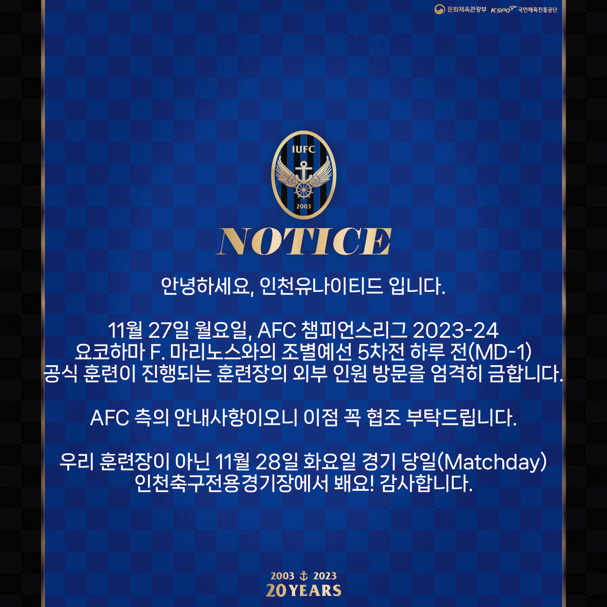 AFC 측의 안내사항이오니 이점 꼭 협조 부탁드립니다. 우리 훈련장이 아닌 11월 28일 화요일 경기 당일(Matchday) 인천축구전용경기장에서 봬요! 감사합니다.INCHEON UNITEDMEDIA FEEDS
