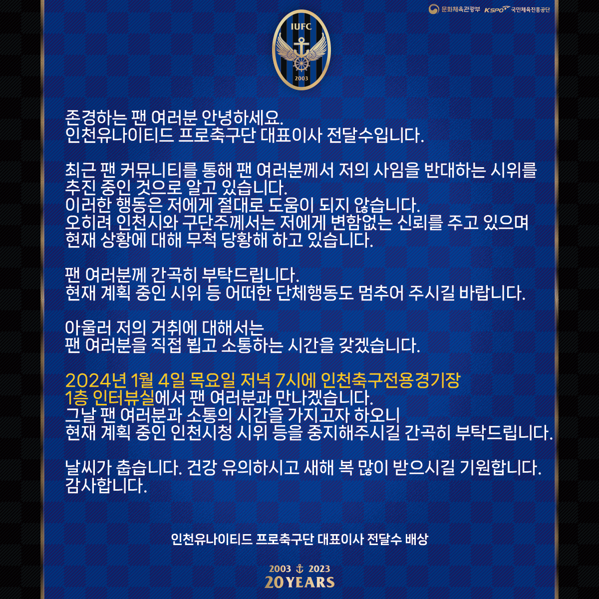 2024년 1월 4일 목요일 저녁 7시에 인천축구전용경기장 1층 인터뷰실에서 팬 여러분과 만나겠습니다.