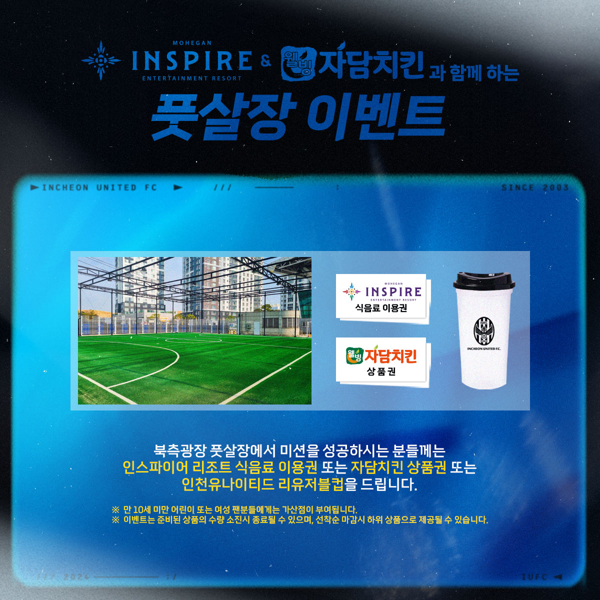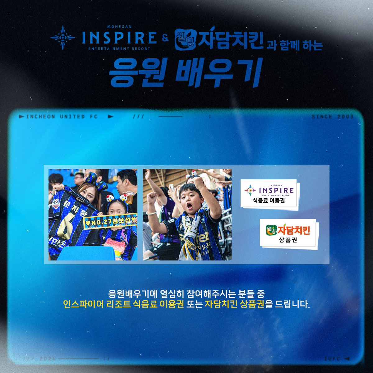 경기 전 응원배우기를 열심히 따라해주시는 분들 중 인스파이어 리조트 식음료 이용권 또는 자담치킨 상품권을 드립니다.