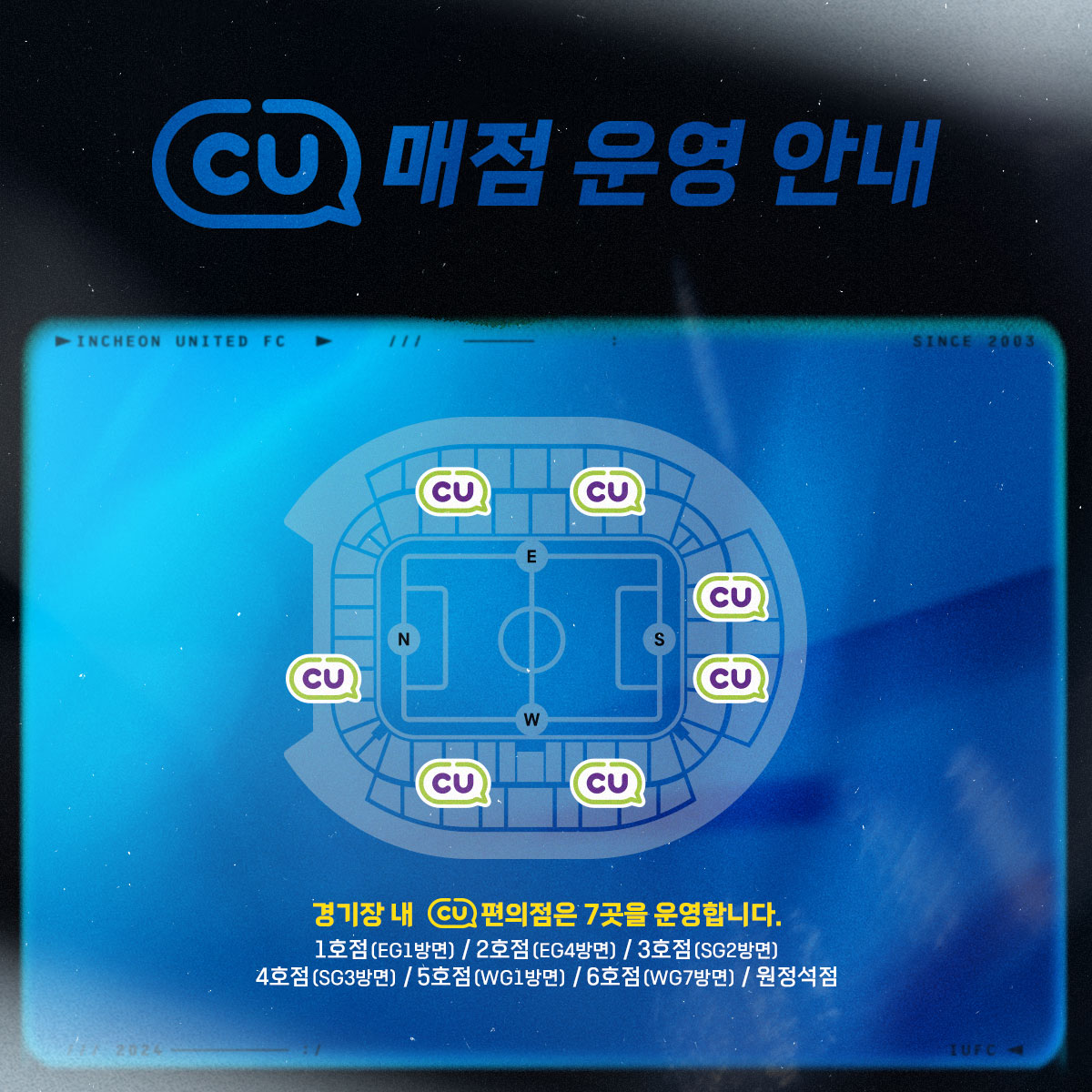 홈경기 당일 경기장 내 CU 편의점 7곳을 운영합니다. 자세한 사항은 이미지를 참고해주세요.