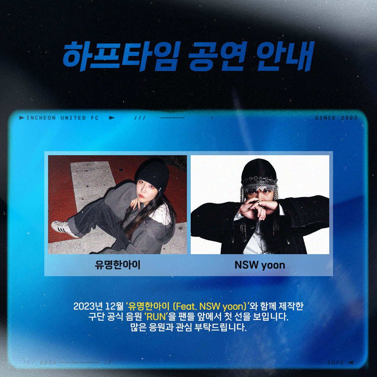 2023년 12월 구단과 함께 공식음원 'RUN'을 발매한 뮤지션 '유명한아이'의 공연이 하프타임에 있습니다.