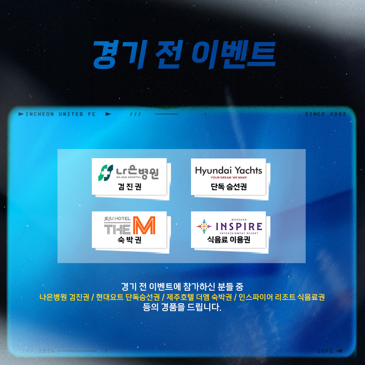 경기 전 이벤트에 참가하신 분들 중 나은병원 검진권, 현대요트 단독승선권, 제주호텔 더엠 숙박권, 인스파이어 리조트 식음료권 등의 다양한 구단 후원사의 경품을 드립니다!