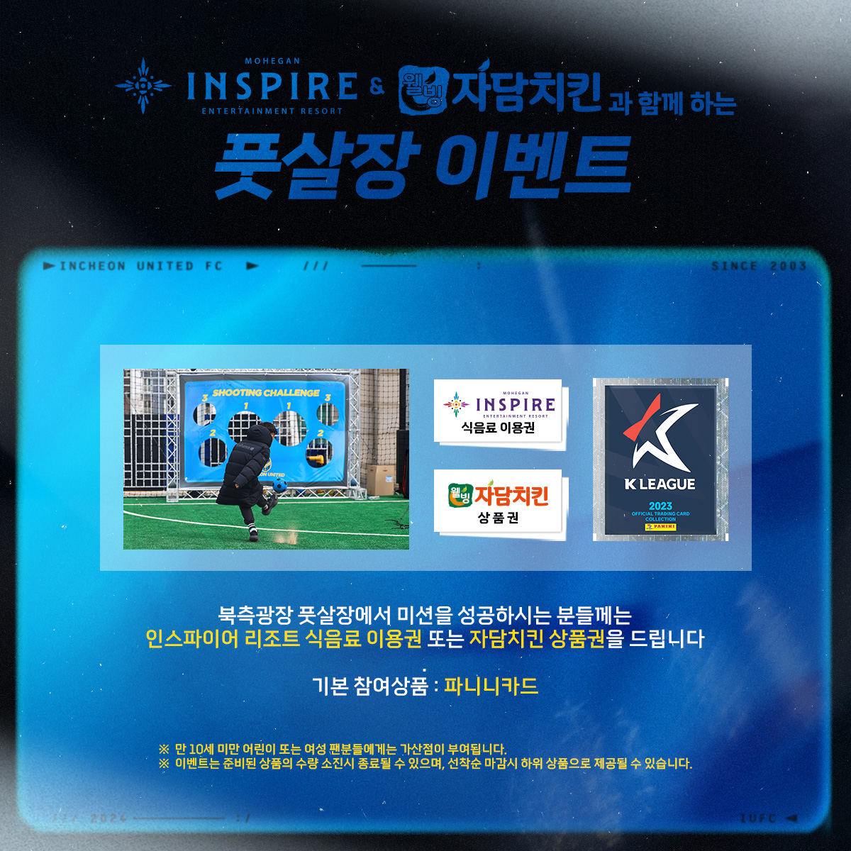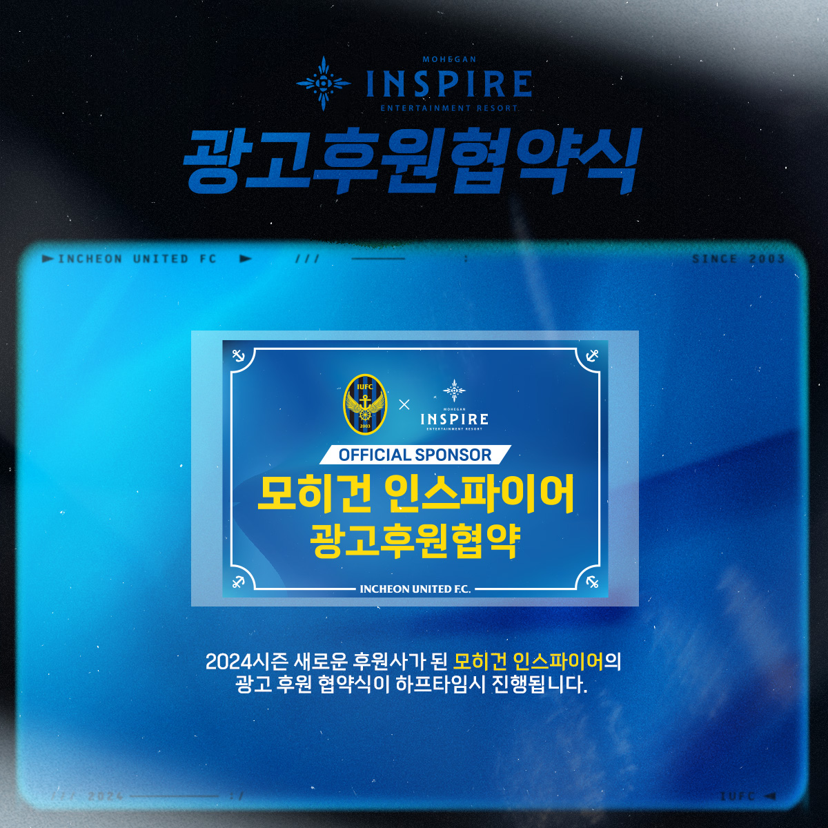 인천유나이티드의 매 홈경기에 다채로운 리조트 시설과 엔터테인먼트 요소, 최고의 접객서비스를 결합한 초대형 규모의 엔터테인먼트 복합 리조트인 모히건 인스파이어 엔터테인먼트 리조트의 상품이 제공될 예정이오니 팬 여러분들의 많은 관심을 부탁드립니다!