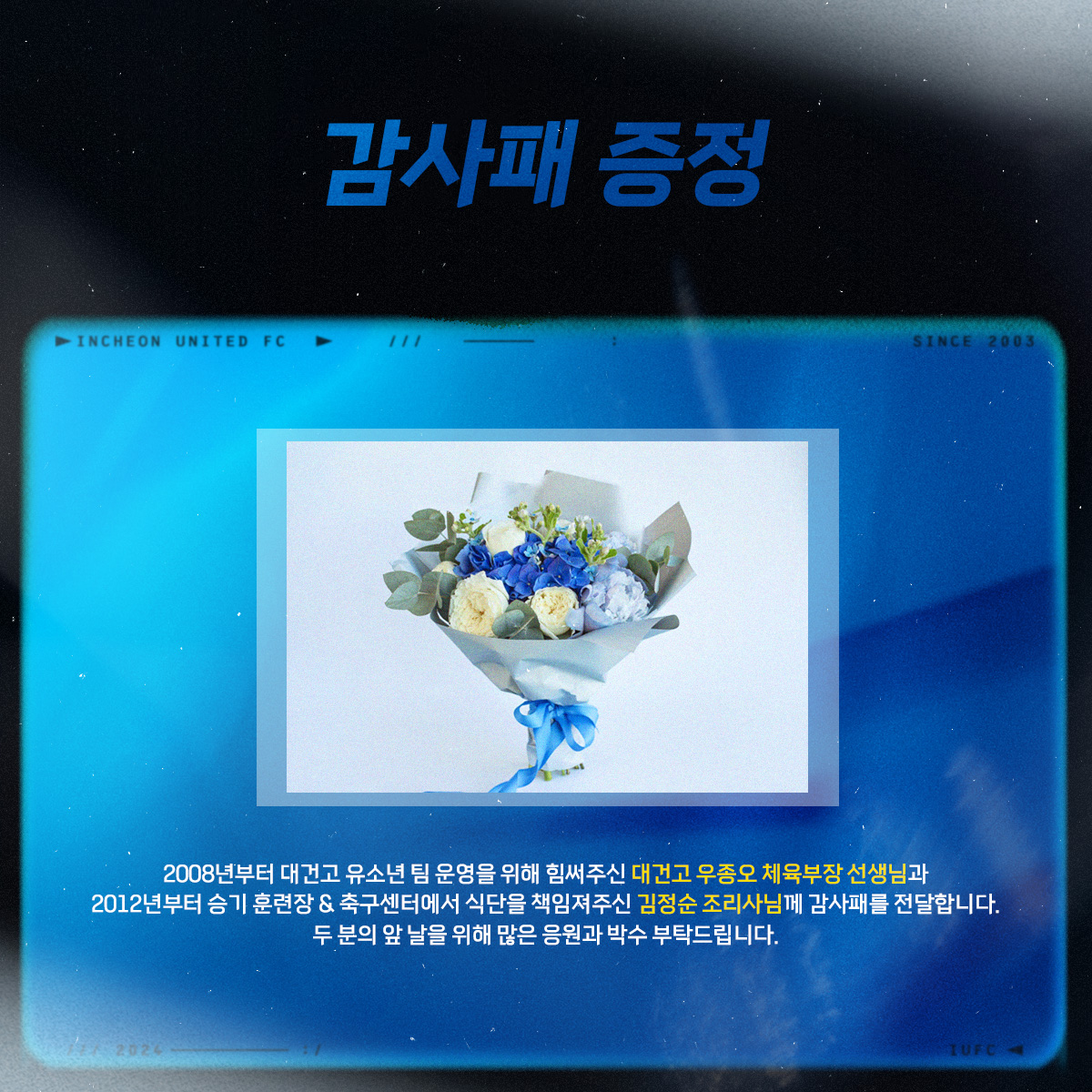 이번 홈경기 식전 행사로 2008년부터 구단의 뿌리인 U-18 유소년팀 운영을 위해 힘써주신 우종우 대건고등학교 체육부장 선생님과
