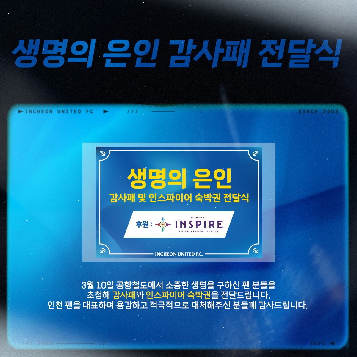 이번 홈경기에서는 지난 3월 10일 하나은행 K리그1 2R 서울 원정 경기 후 공항철도에서 소중한 생명을 구하신 용감한 팬 분들에게 감사패와 감사 선물을 전달드릴 예정입니다.