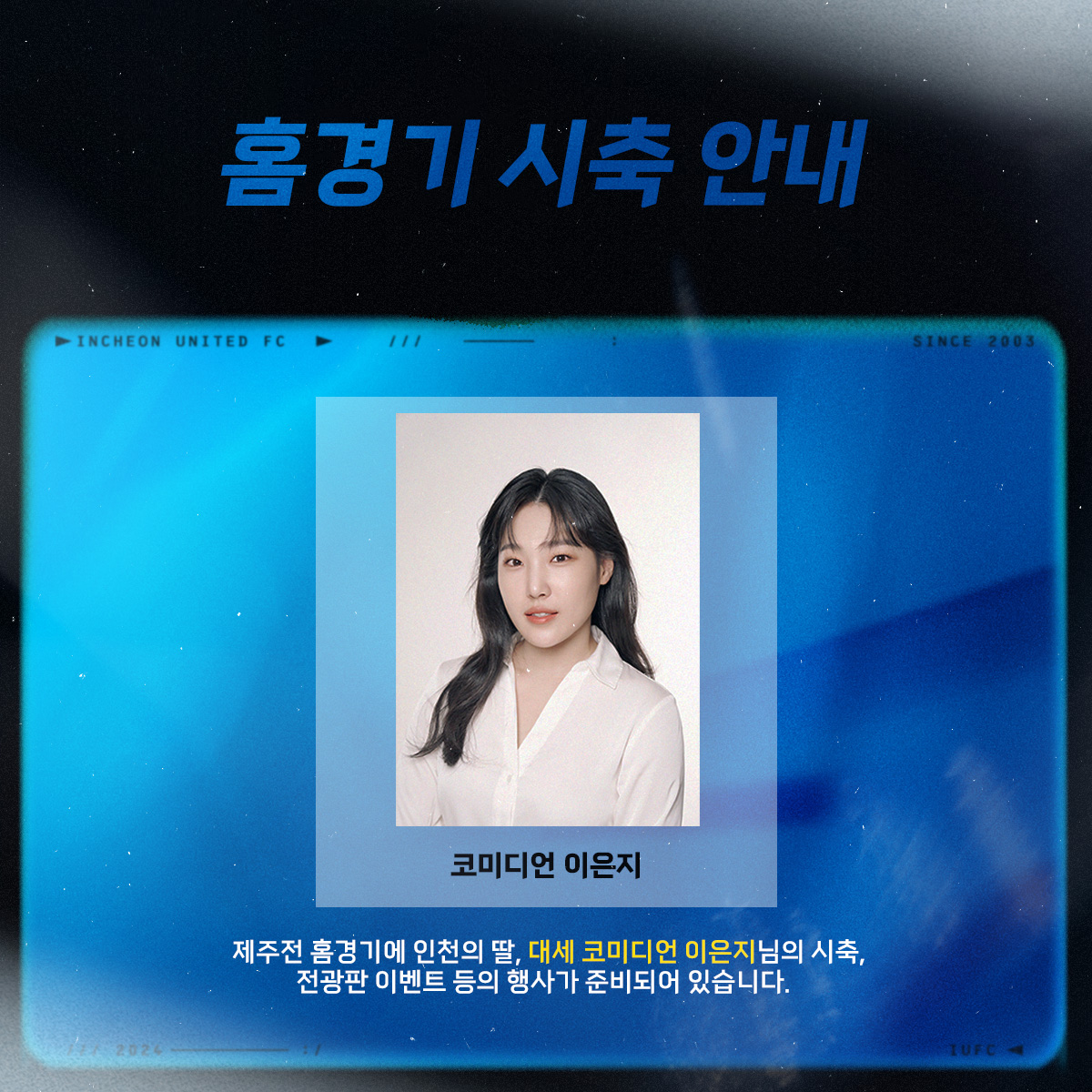 제주전 홈경기에 인천의 딸, 대세 코미디언 이은지님의 시축, 전광판 이벤트 등의 행사가 준비되어 있습니다!