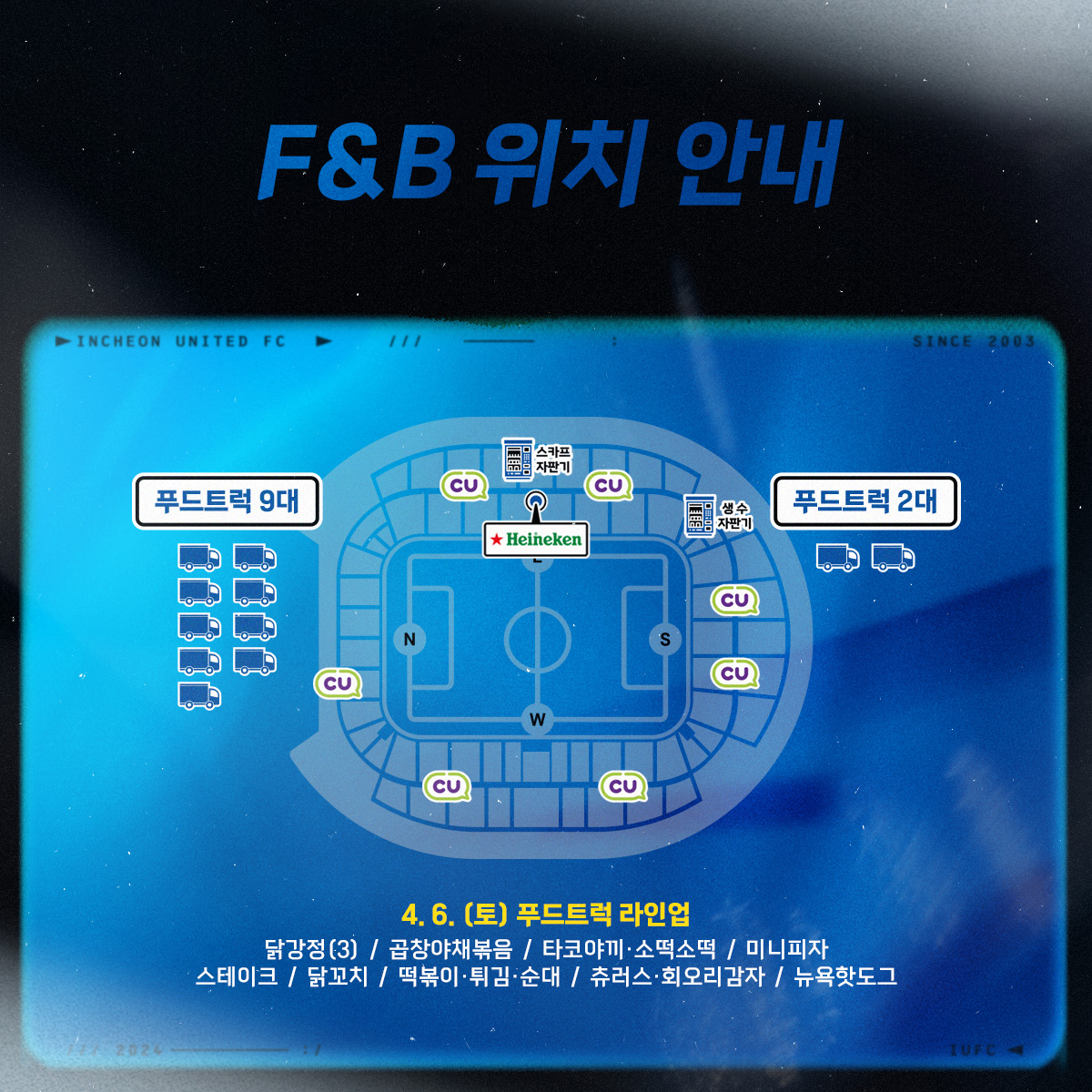 또한, 경기장 내 E석 하이네켄펍에서는 생맥주를 판매하며 경기장 내 CU 편의점 7곳을 운영할 예정입니다.