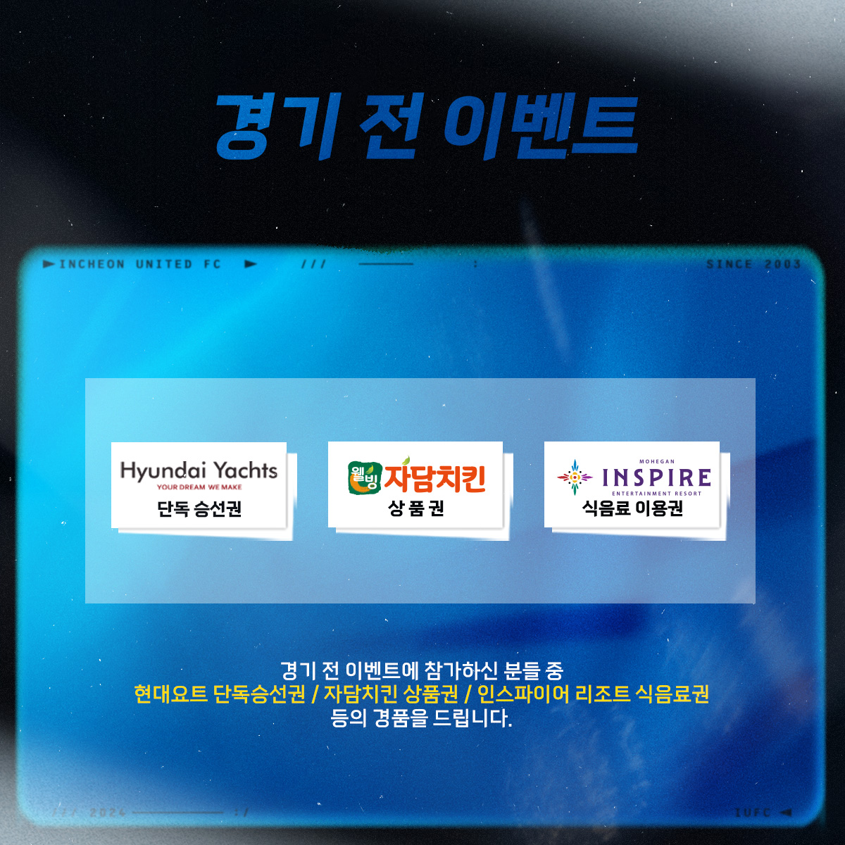 경기 전 이벤트에 참가하신 분들 중 현대요트 단독승선권, 인스파이어 리조트 식음료권, 자담치킨 상품권 등의 다양한 구단 후원사의 경품을 드립니다!