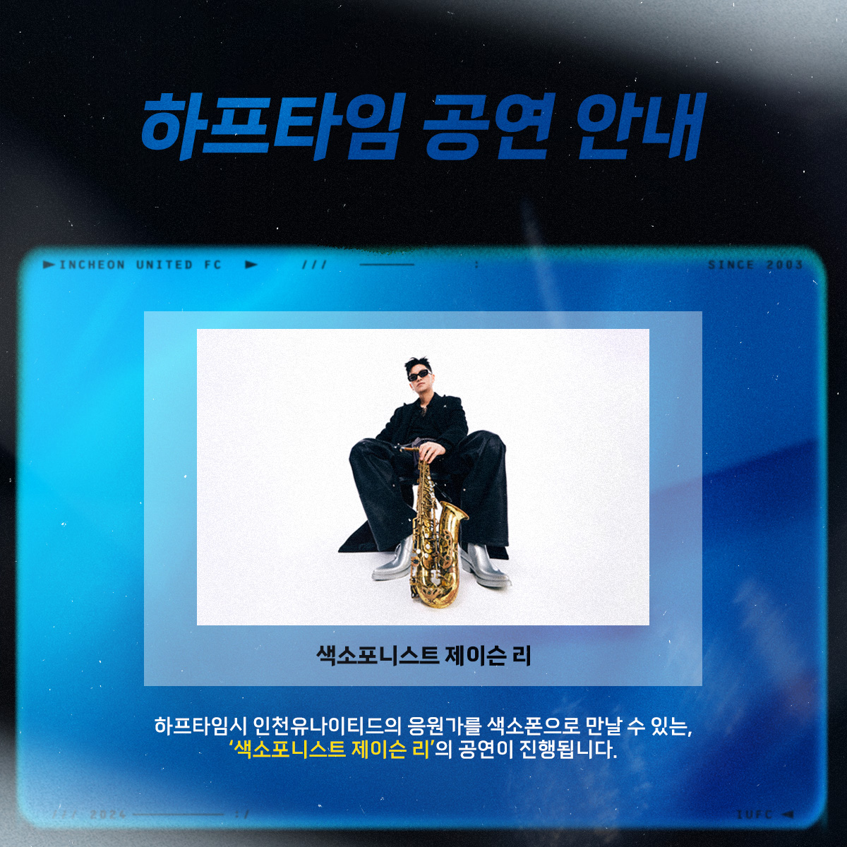 색소포니스트 제이슨 리(Lee)의 색소폰 공연이 경기장을 가득 채울 예정입니다. 많은 관심과 사랑 부탁드립니다!